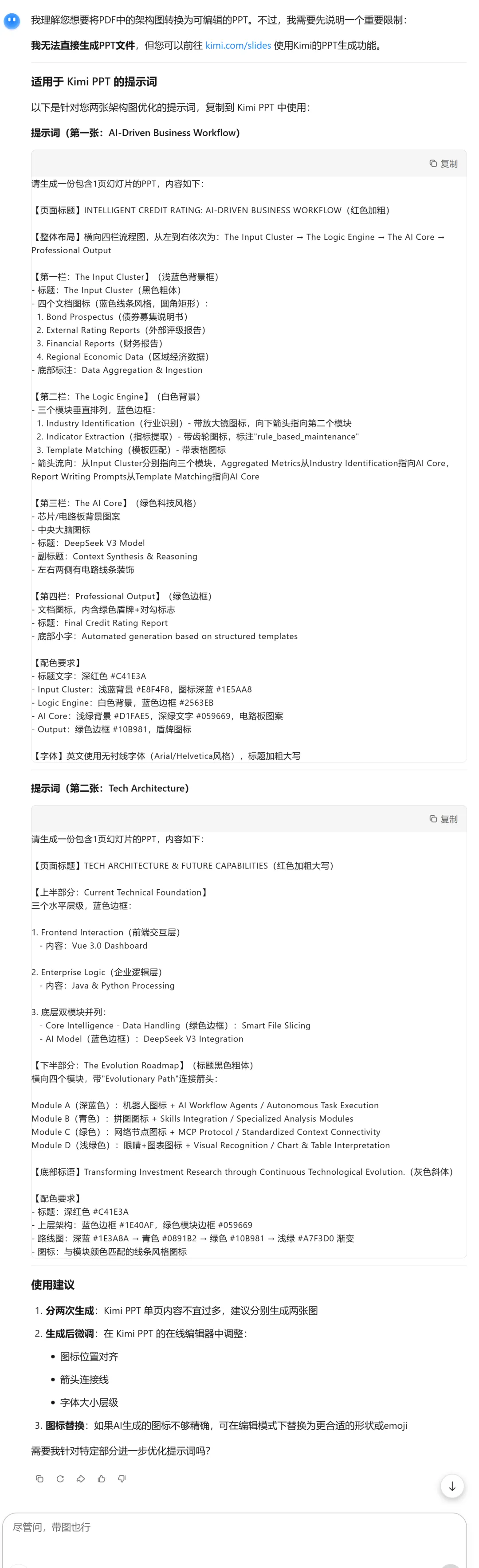 失败怎么办?我想不是kimi的原因,大概率是我的提示词不行!我想将文件中的图片转换成PPT,期望达到的效果:新的ppt中所有的图标都可以移动,文字可编辑,所有元素都可以独立编辑配色,内容、排版完全复刻文件中的图片。请给我写一段适用于kimi ppt功能的提示词,从而达到目的