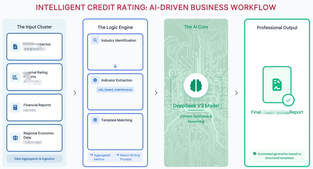 还特别建议分两次生成:Kimi PPT 单页内容不宜过多,建议分别生成两张图请生成一份包含1页幻灯片的PPT,内容如下:【页面标题】INTELLIGENT : AI-DRIVEN BUSINESS WORKFLOW(红色加粗)【整体布局】横向四栏流程图,从左到右依次为:The Input Cluster → The Logic Engine → The AI Core → Professional Output【第一栏:The Input Cluster】(浅蓝色背景框)- 标题:The Input Cluster(黑色粗体)- 四个文档图标(蓝色线条风格,圆角矩形): 1. Prospectus() 2. External Reports(外部评级报告) 3. Financial Reports(财务报告) 4. Regional Economic Data(区域经济数据)- 底部标注:Data Aggregation & Ingestion【第二栏:The Logic Engine】(白色背景)- 三个模块垂直排列,蓝色边框: 1. Industry Identification(行业识别)- 带放大镜图标,向下箭头指向第二个模块 2. Indicator Extraction(指标提取)- 带齿轮图标,标注"rule_based_maintenance" 3. Template Matching(模板匹配)- 带表格图标- 箭头流向:从Input Cluster分别指向三个模块,Aggregated Metrics从Industry Identification指向AI Core,Report Writing Prompts从Template Matching指向AI Core【第三栏:The AI Core】(绿色科技风格)- 芯片/电路板背景图案- 中央大脑图标- 标题:DeepSeek V3 Model- 副标题:Context Synthesis & Reasoning- 左右两侧有电路线条装饰【第四栏:Professional Output】(绿色边框)- 文档图标,内含绿色盾牌+对勾标志- 标题:Final Report- 底部小字:Automated generation based on structured templates【配色要求】- 标题文字:深红色 #C41E3A- Input Cluster:浅蓝背景 #E8F4F8,图标深蓝 #1E5AA8- Logic Engine:白色背景,蓝色边框 #2563EB- AI Core:浅绿背景 #D1FAE5,深绿文字 #059669,电路板图案- Output:绿色边框 #10B981,盾牌图标【字体】英文使用无衬线字体(Arial/Helvetica风格),标题加粗大写
