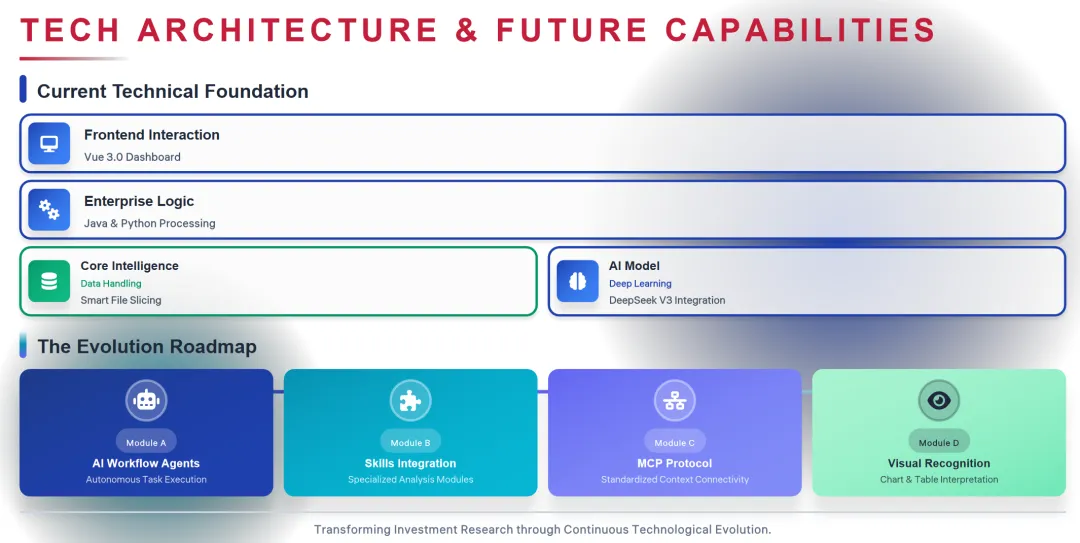 请生成一份包含1页幻灯片的PPT,内容如下:【页面标题】TECH ARCHITECTURE & FUTURE CAPABILITIES(红色加粗大写)【上半部分:Current Technical Foundation】三个水平层级,蓝色边框:1. Frontend Interaction(前端交互层) - 内容:Vue 3.0 Dashboard2. Enterprise Logic(企业逻辑层) - 内容:Java & Python Processing3. 底层双模块并列: - Core Intelligence - Data Handling(绿色边框):Smart File Slicing - AI Model(蓝色边框):DeepSeek V3 Integration【下半部分:The Evolution Roadmap】(标题黑色粗体)横向四个模块,带"Evolutionary Path"连接箭头:Module A(深蓝色):机器人图标 + AI Workflow Agents / Autonomous Task ExecutionModule B(青色):拼图图标 + Skills Integration / Specialized Analysis Modules Module C(蓝紫色):网络节点图标 + MCP Protocol / Standardized Context ConnectivityModule D(淡蓝色):眼睛+图表图标 + Visual Recognition / Chart & Table Interpretation【底部标语】Transforming Investment Research through Continuous Technological Evolution.(灰色斜体)【配色要求】- 标题:深红色 #C41E3A- 上层架构:蓝色边框 #1E40AF,绿色模块边框 #059669- 路线图:深蓝 #1E3A8A → 青色 #0891B2 → 蓝紫色 #10B981 → 淡蓝 #A7F3D0 渐变- 图标:与模块颜色匹配的线条风格图标