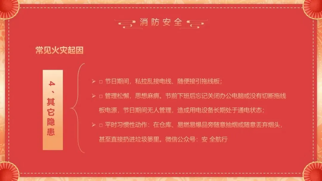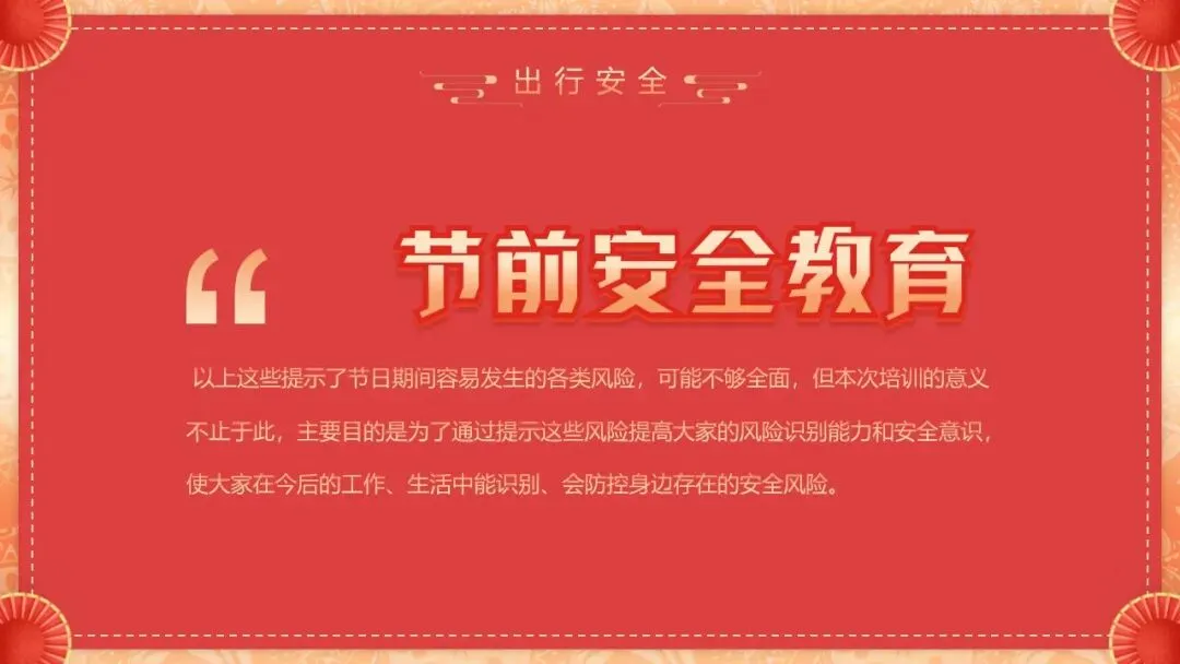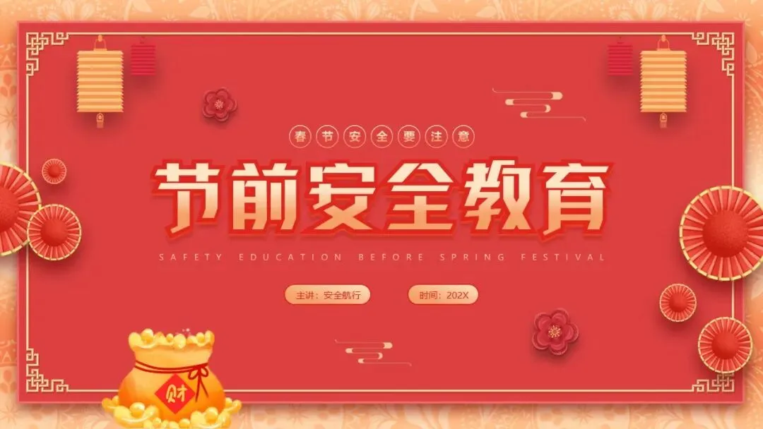 为护航万家团圆,助力企业及个人平安迎新年,“安全航行”特别整理汇总了一份《节前培训节后复工课件系列【第3套】春节节前节后课件》,从网络精心搜集并分类整合了72个实用、即用的安全教育培训课件,涵盖节前隐患排查、出行安全、居家消防、应急处理、复工复产等重点场景,助你系统筑牢节日安全防线。