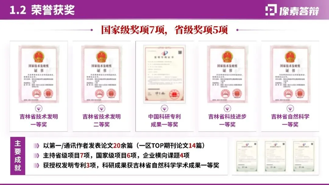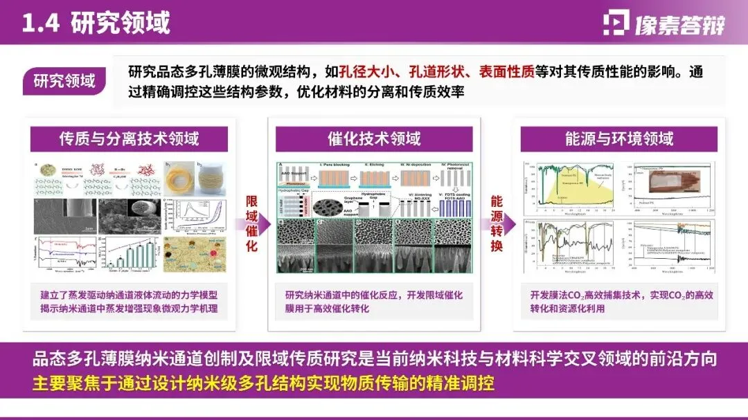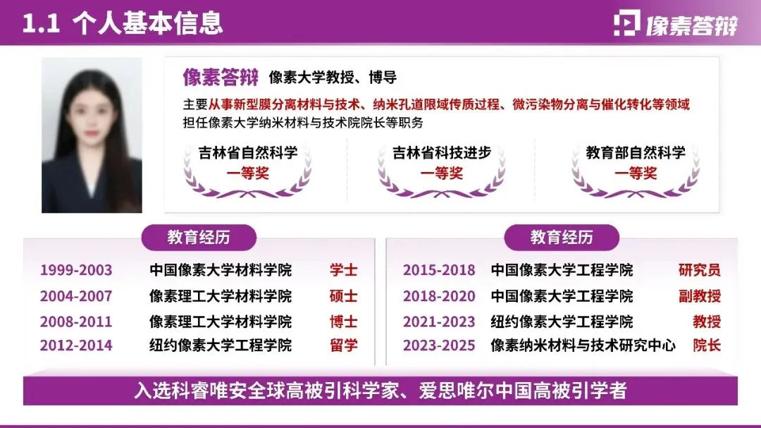 答辩人是xx大学纳米科学中心的教授(博导),主要研究新型膜分离材料、纳米孔道传质等方向,曾获吉林省自然科学一等奖、教育部自然科学一等奖等,同时入选科睿唯安全球高被引科学家。
