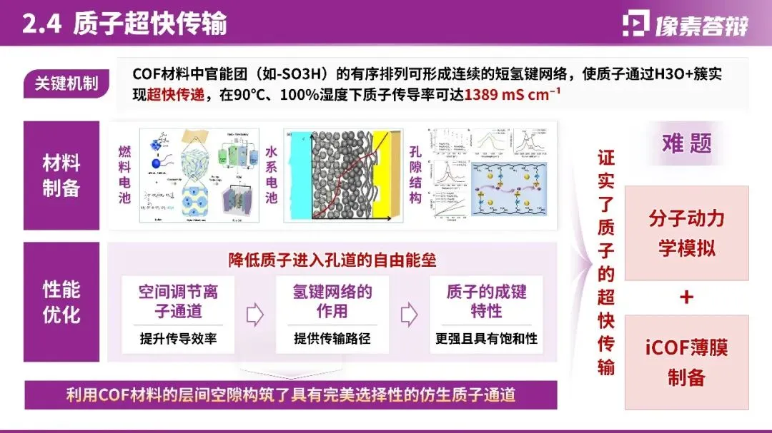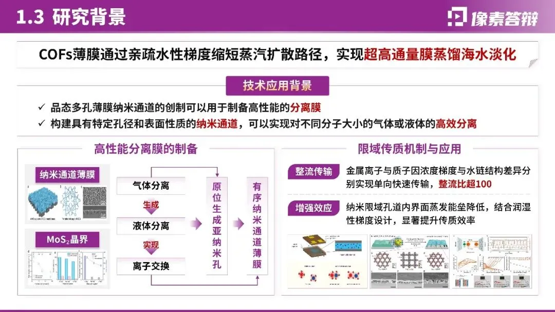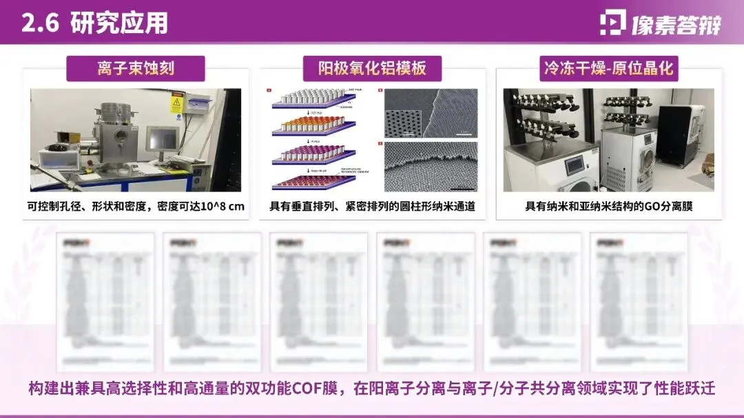 - 技术应用:通过离子束蚀刻、阳极氧化铝模板等技术,构建出高选择性、高通量的 COF 膜,实现离子 / 分子分离性能突破。