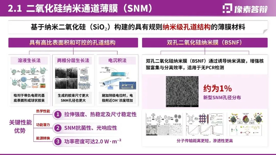 - 二氧化硅纳米通道薄膜(SNM)可通过溶液生长法等制备,兼具高稳定性、抗菌性,功率密度达 2.0 W・m⁻²;双孔型(BSNF)能提升核酸分离效率,适用于无 PCR 检测。