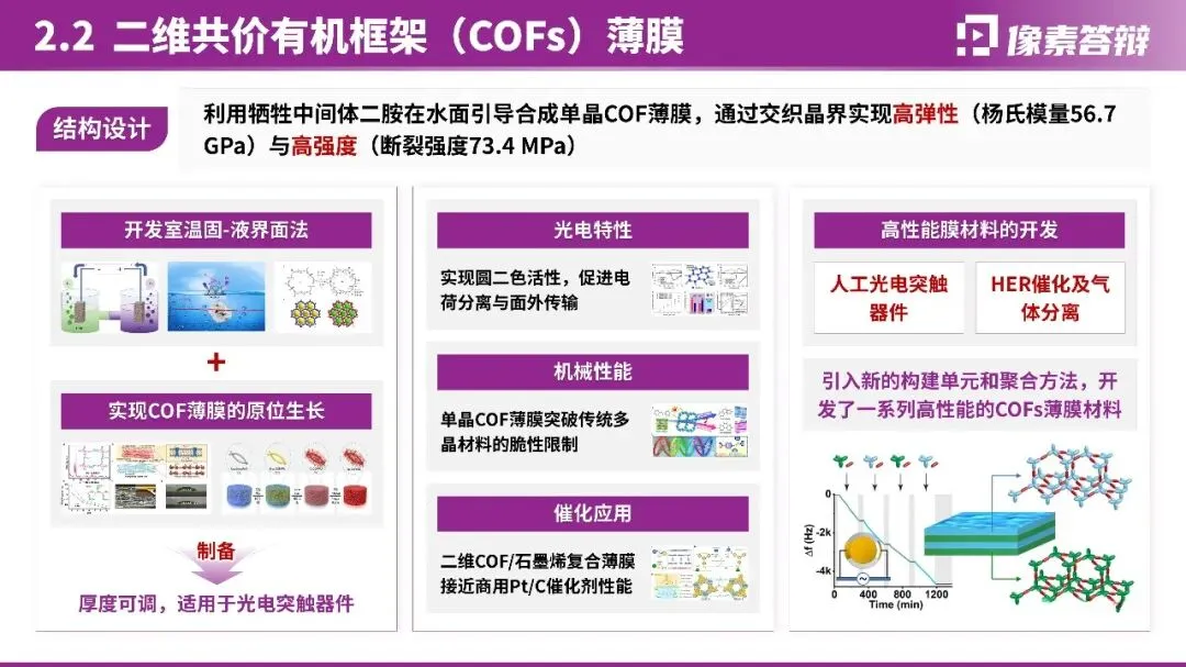 - 二维共价有机框架(COFs)薄膜用室温固 - 液界面法制备,单晶薄膜兼具高弹性(杨氏模量 56.7 GPa)与高强度,可用于人工光电突触、HER 催化等场景。