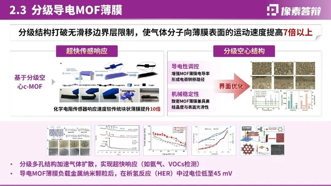 - 分级导电 MOF 薄膜分级结构让气体分子运动速度提升 7 倍,传感响应速度是传统薄膜的 10 倍;负载金属颗粒后,析氢反应过电位低至 45 mV。