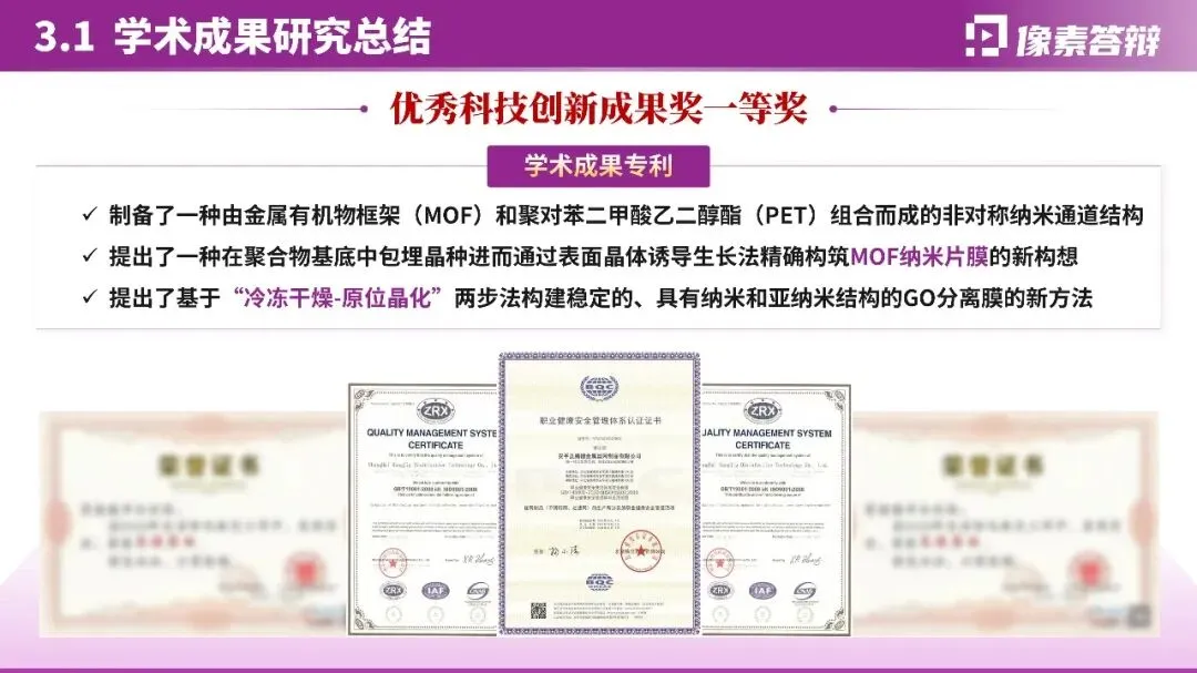 - 专利成果:提出 MOF 纳米片膜构筑、“冷冻干燥 - 原位晶化” 制备 GO 分离膜等新方法,获优秀科技创新成果奖一等奖。