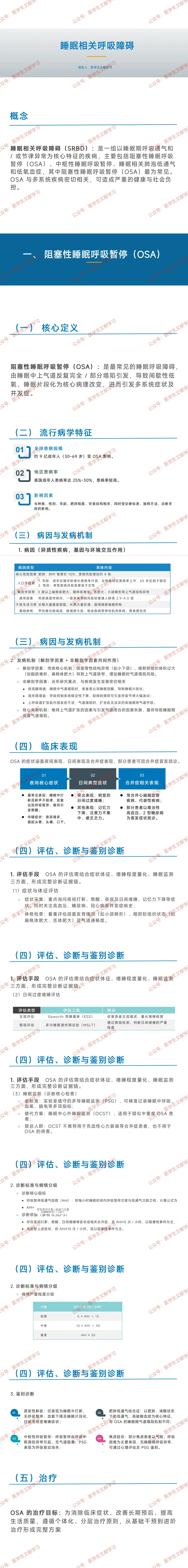 睡眠相关呼吸障碍是一组以睡眠期呼吸通气和 / 或节律异常为核心的疾病,主要包括阻塞性睡眠呼吸暂停(OSA)、中枢性睡眠呼吸暂停(CSA)、睡眠相关肺泡低通气障碍等,其中 OSA 最常见,可引发多系统并发症,核心管理逻辑为 “精准分型、分层干预、去除诱因”。