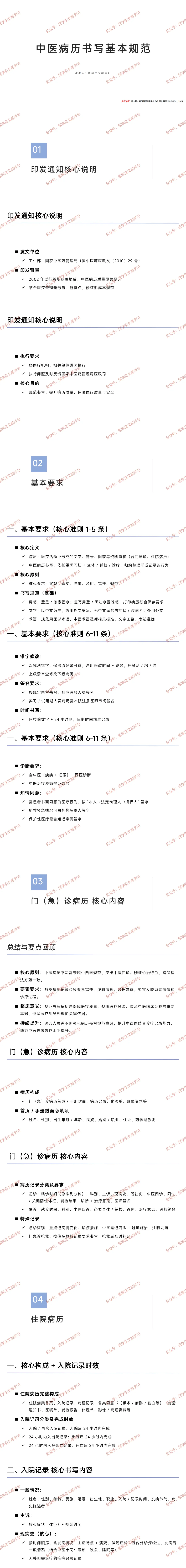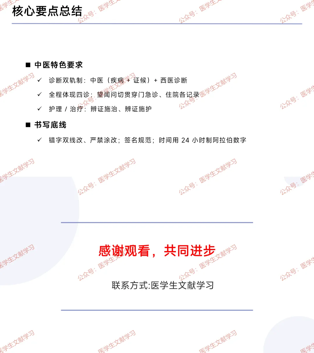 - 初诊:记录就诊时间(急诊到分钟)、科别、主诉、现病史、既往史、中医四诊、阳性 / 关键阴性体征、辅检结果、诊断 + 治疗意见、医师签名。