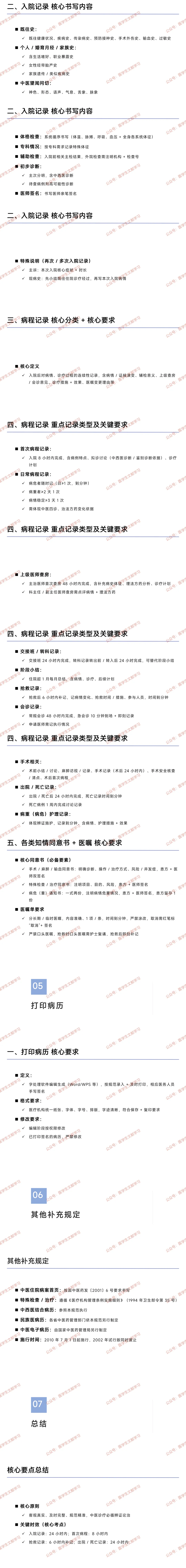 - 其他关键记录:交接班 / 转科记录 24 小时内完成;阶段小结(住院超 1 月每月 1 次);抢救记录 6 小时内补记(时间到分钟);会诊记录(常规 48 小时内,急会诊 10 分钟到场并即刻记录);手术相关记录(术后 24 小时内完成手术记录);出院 / 死亡记录 24 小时内完成,死亡病例 1 周内完成讨论记录。