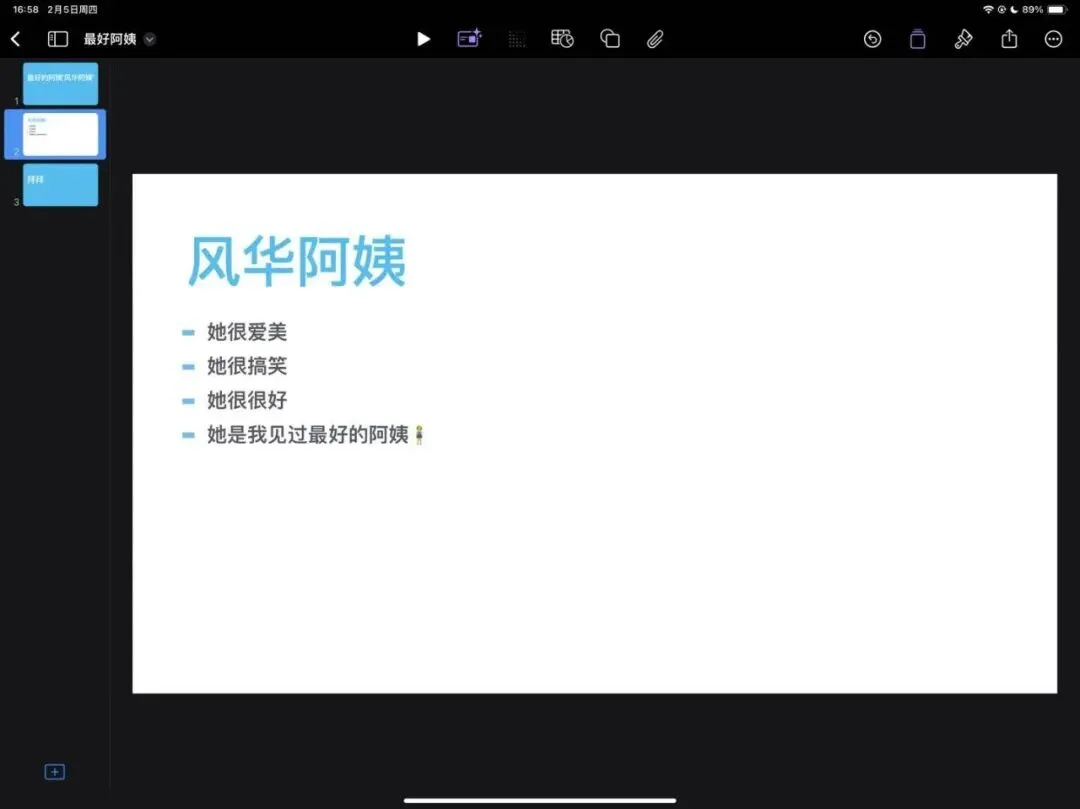 大道至简,这篇PPT,简约而不简单,没有技巧,全是感情!客观事实与主观感受完美融合,寥寥几个字,风华阿姨的美好形象跃然纸上,并在最后的结语中得以升华。