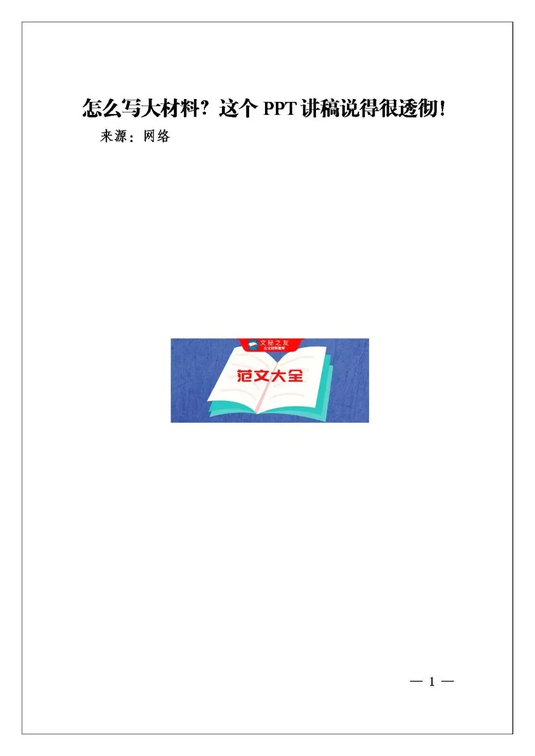 今天这篇《怎么写大材料?这个PPT讲稿说得非常透彻!》然只看到封面,光标题能感觉到它是个“干货型”材料。标题直接点出痛点——“大材料”怎么写,用“非常透彻”三个字给自己定调,说明内容一定不浮于表面。