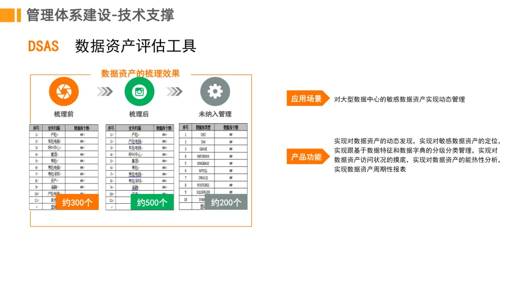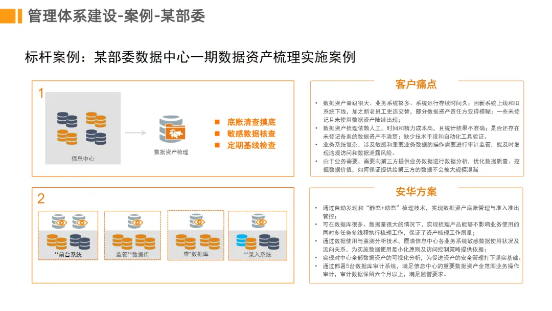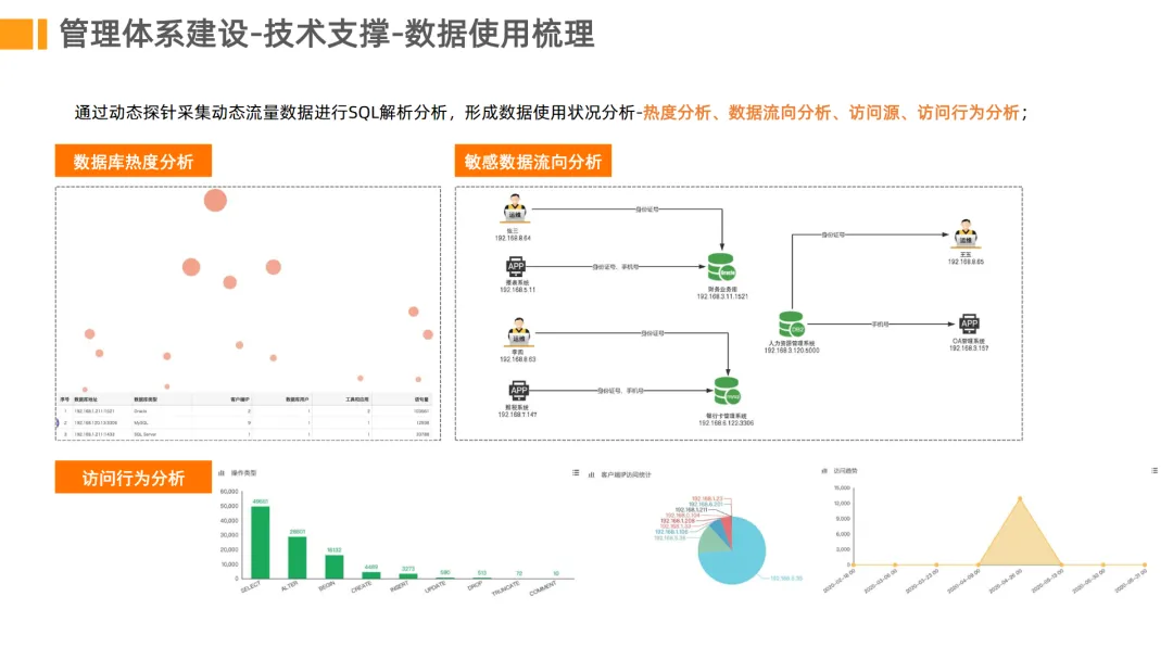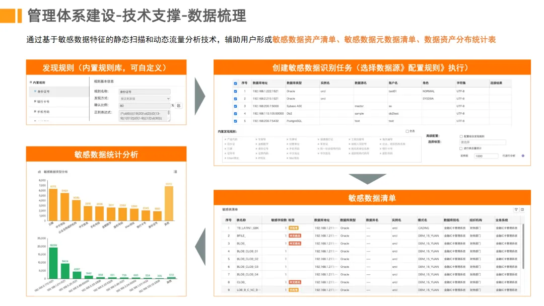 数据资产梳理。通过自动化扫描技术动态发现数据库资产,建立敏感数据资产清单。帮助企业掌握数据分布情况,解决资产底数不清的问题。