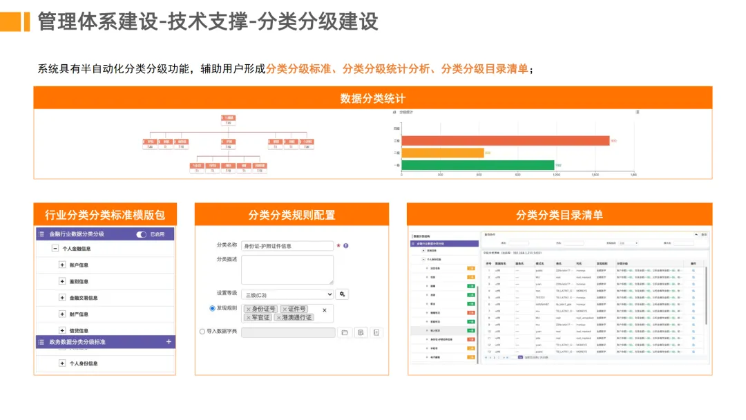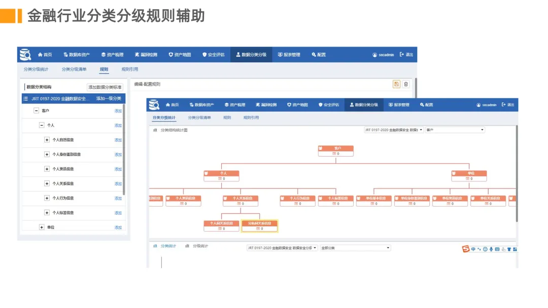 分类分级保护。依据金融行业数据安全分级指南等标准,对数据进行自动分类分级。建立不同级别的安全防护策略,实现准确防护。