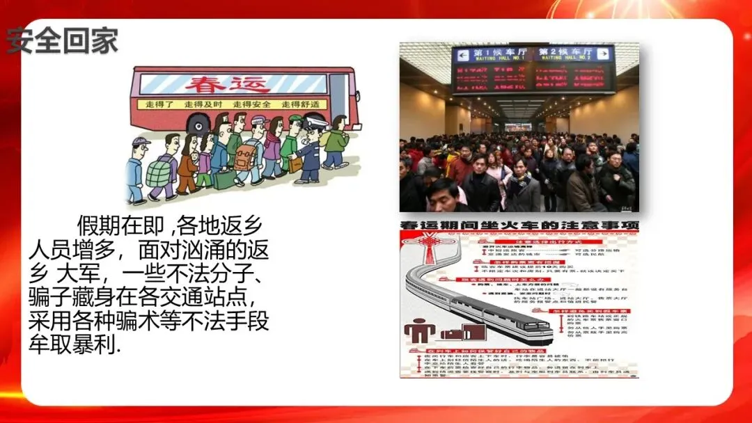 春节是我国人民的传统节日。俗话说: “有钱没钱回家过年。”如何过一个欢乐、祥和、文明的春节,是我们关注的焦点对于企事业单位来说,春节期间,人员流动性大,节前回家心切,心理躁动容易滋生各种安全隐患,因此,做好节前安全教育是必不可少的安全举措!