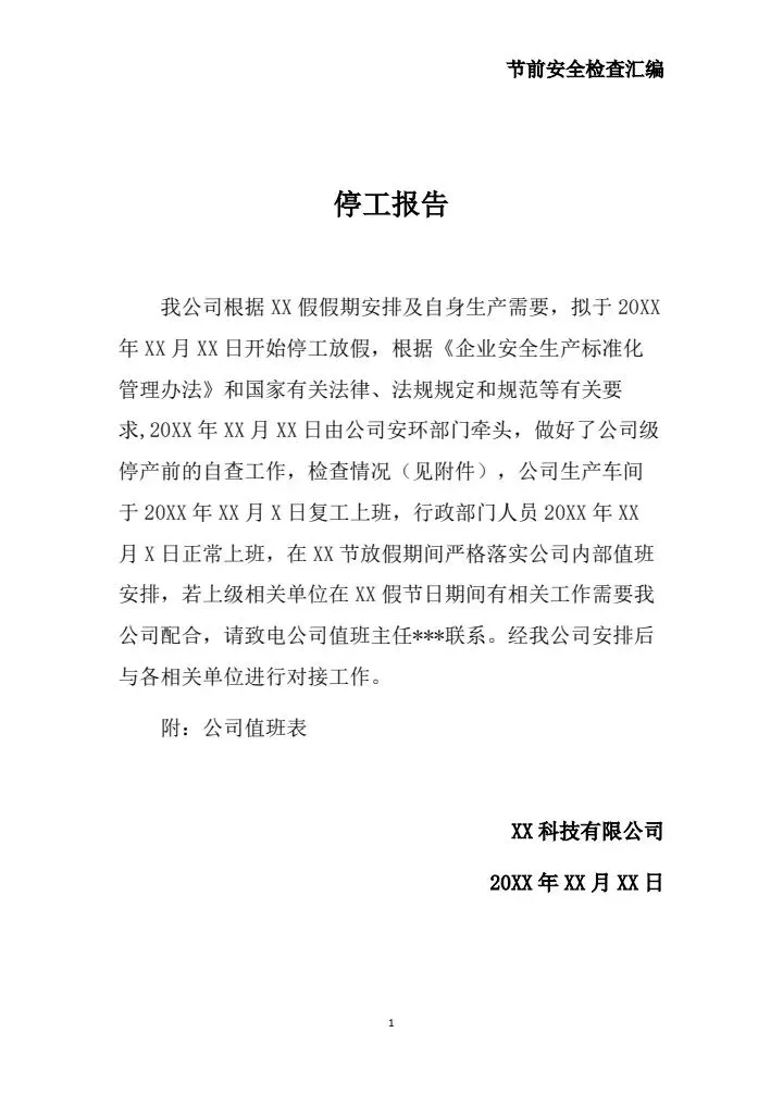 我公司根据春节假期安排及自身生产需要,拟于2026年2月15日开始停工放假,根据《企业安全生产标准化管理办法》和国家有关法律、法规规定和规范等有关要求,2025年1月23日由公司安环部门牵头,做好了公司级停产前的自查工作,检查情况(见附件),公司生产车间于2026年2月24日复工上班,在春节节放假期间严格落实公司内部值班安排,若上级相关单位在春节节假日期间有相关工作需要我公司配合,请致电公司值班主任XXX联系。经我公司安排后与各相关单位进行对接工作。