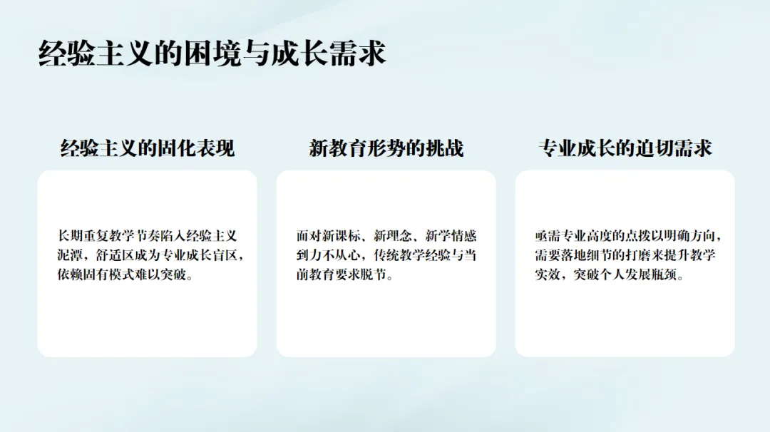 人到中年,我不缺一线教学的经验。相反,长期重复的教学节奏,让我陷入经验主义的泥潭,那些自以为的舒适区竟然成了专业成长的盲区,面对新课标、新理念、新学情,常常感到力不从心。我迫切地需要专业高度的点拨和落地细节的打磨,工作室“名师引领+同伴互助”的精准赋能,恰好为我补齐短板,让教学能力实现了精准、扎实的进阶。