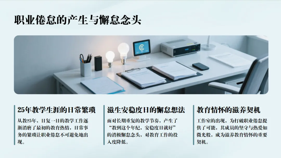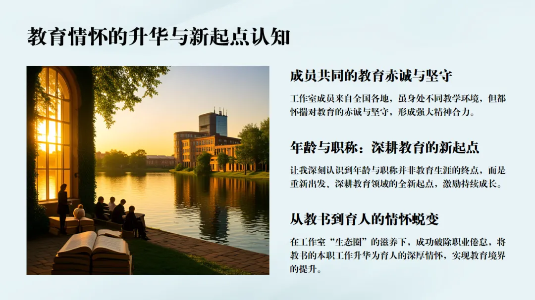 从教25年,日复一日的繁琐工作,最初的教育热情慢慢被消磨,不可避免地陷入到职业倦怠,生出“教到这个年纪,安稳度日就好”的懈怠念头。工作室同伴们的坚守与热爱,像一束束微光,驱散了我心底的倦怠,让我重新找回了教书育人的初心与情怀。