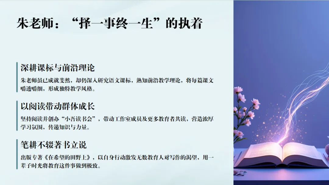 在朱老师身上,我读懂了“择一事终一生”的执着。她比我年长几岁,早已是传统意义上教师中的人生赢家,却从没有停下成长的脚步。她深入研究语文课标,熟知语文教学的前沿理论,把每一篇课文都嚼透嚼细,形成自己的教学风格;她坚持阅读,并通过“小吾读书会”带动一群人共读;她笔耕不辍,出版专著《在希望的田野上》,激发无数教育人对写作的渴望;她真的在用一辈子的时光,把一件事做到极致,这份沉下心、扎下根、永不停步的执着深深打动着我。