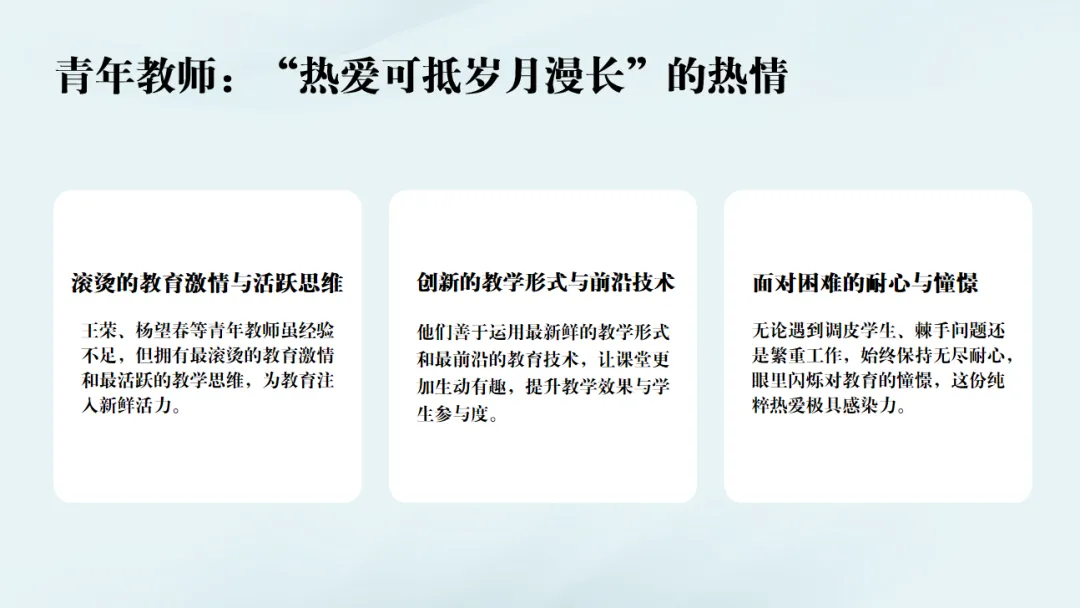 透过青年教师的蓬勃朝气,我则读懂了“热爱可抵岁月漫长”的热情。年轻老师没有丰厚的教学经验,却有着最滚烫的教育激情、最活跃的教学思维、最新鲜的教学形式、最前沿的教育技术。比如,胡筠老师、王荣老师、曾培培老师、杨望春老师等等,她们似乎有着无穷的精力和无尽的耐心,无论面对多调皮的学生、多棘手的问题、多繁重的工作,眼里始终都闪着对教育的憧憬。这份纯粹的热爱同样感染着我。