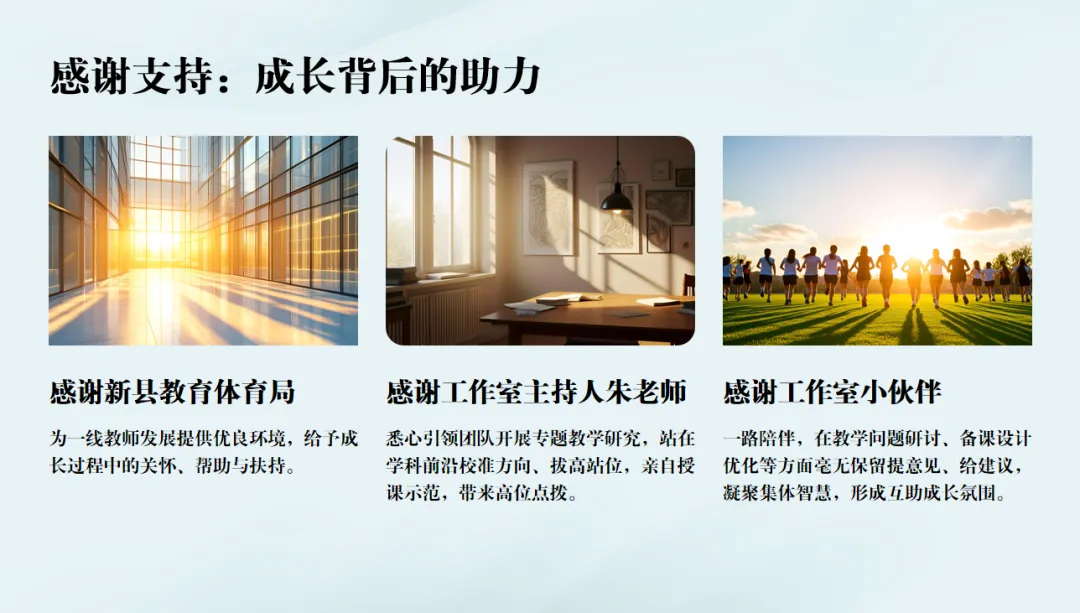 这一切都得益于新县一线教师发展的优良环境,在此衷心感谢新县教育体育局对我们的成长给予的关怀、帮助和扶持,感谢工作室主持人朱老师的悉心引领和小伙伴们的一路陪伴。