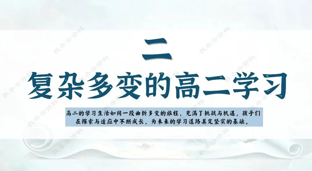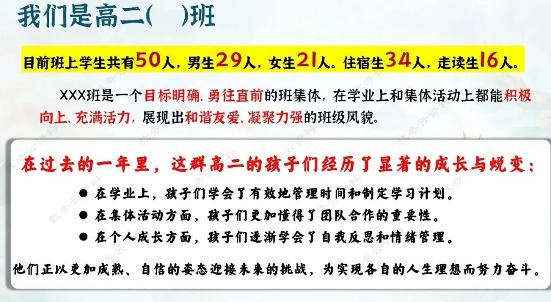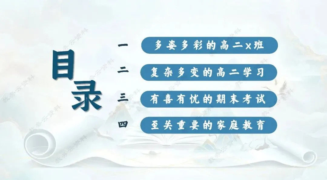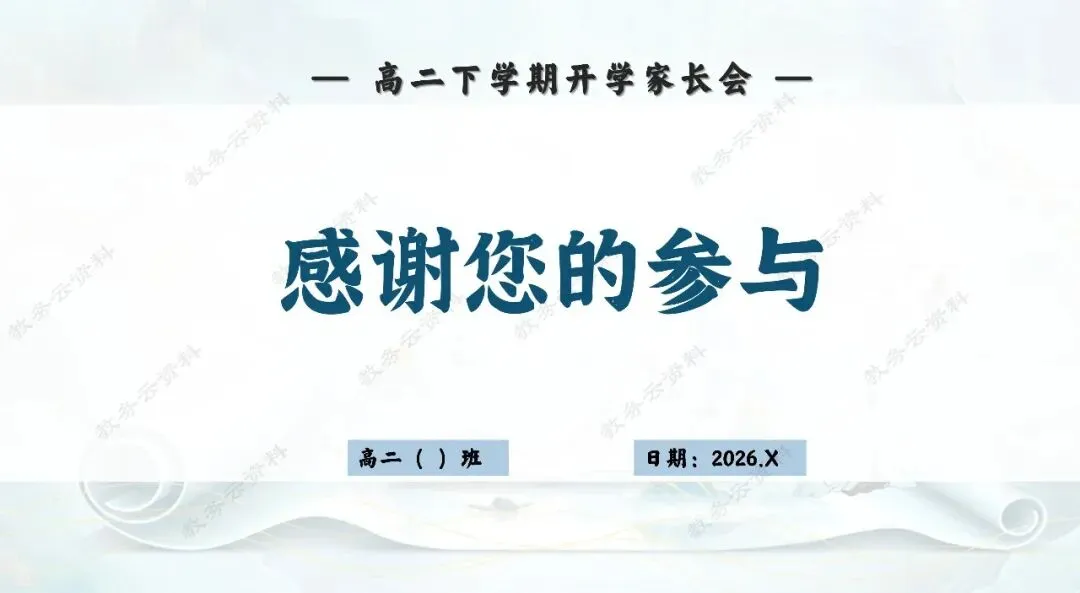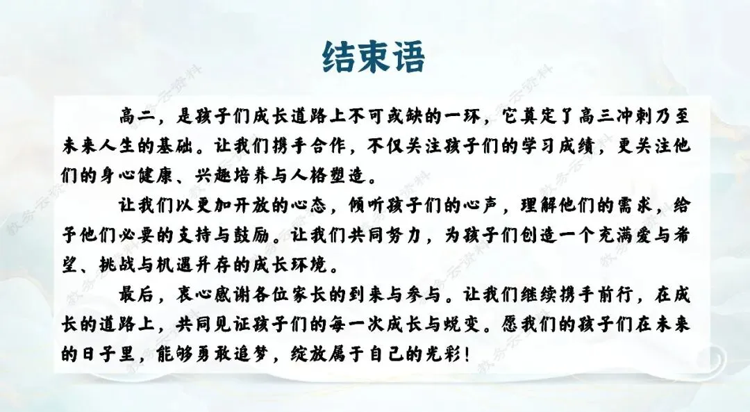 很高兴在这与您相遇,如果您是一位班主任老师,每天除了应对繁重的教学工作,还要加班整理班级、教务、教研、课件PPT资料,请关注下方的“教务云资料”,让我们风雨同路、一起成长!今天分享的是高二年级下学期开学家长会ppt课件,主题是《执笔为剑,共赴高三星河》。课件PPT一共68页,配套班主任教案发言稿。(文末有课件资料的获取方式)点击下方图片,打开小程序,付费查看,可自助下载资料,课件下载后无水印、可编辑、可修改!