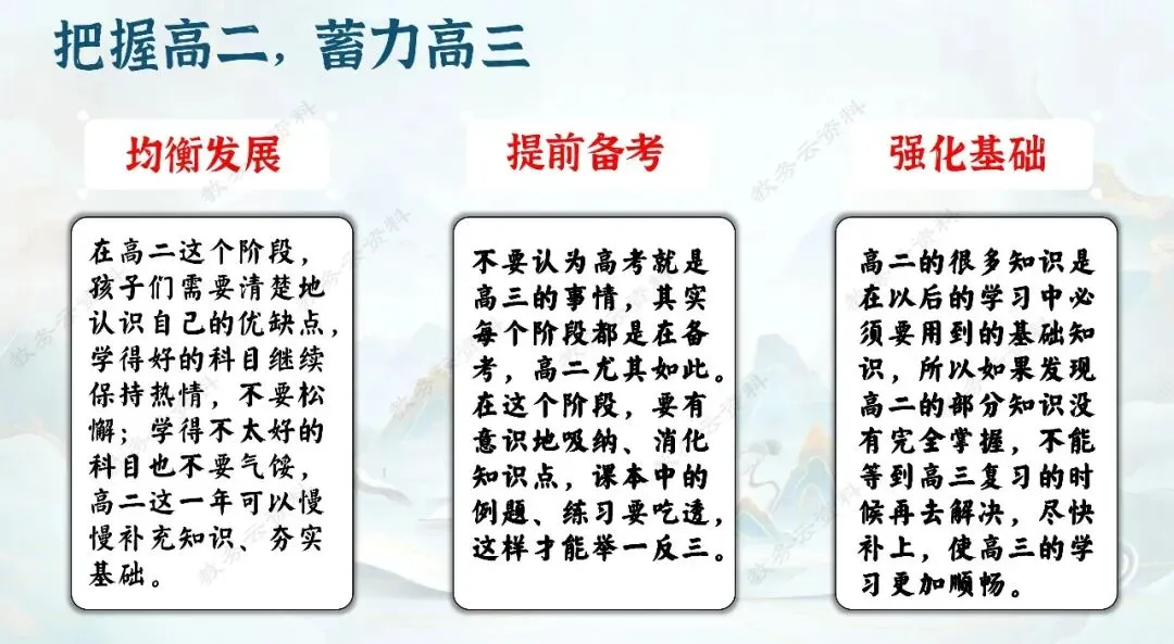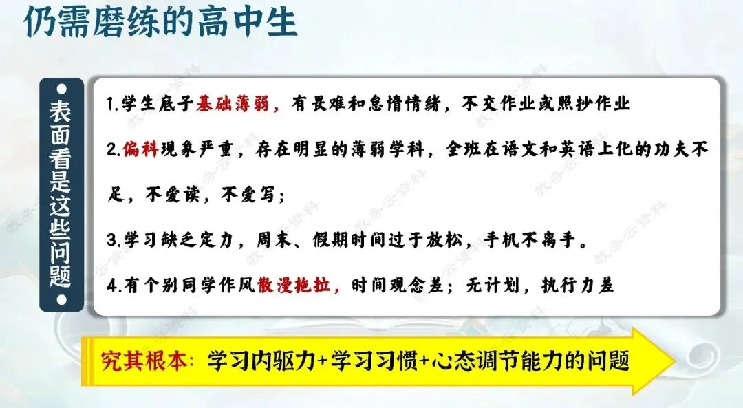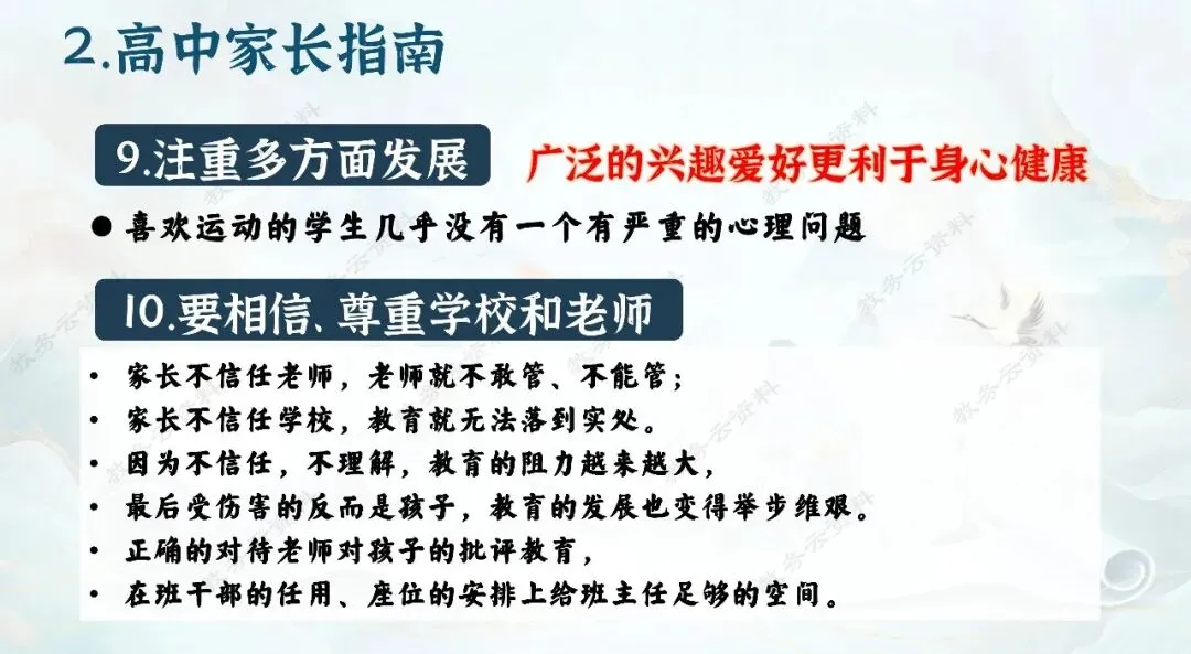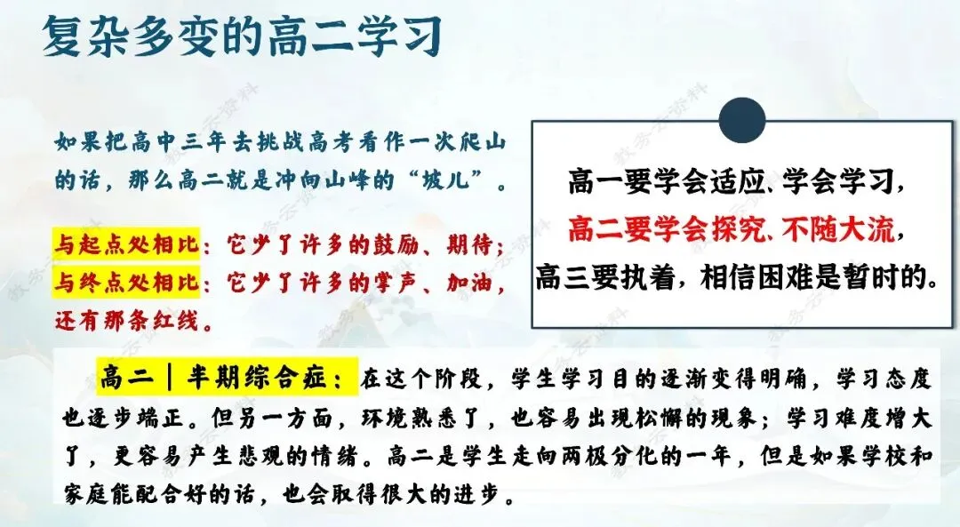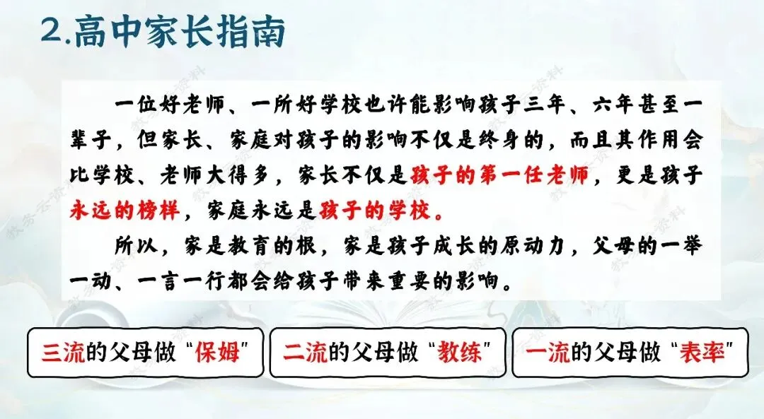 很高兴在这与您相遇,如果您是一位班主任老师,每天除了应对繁重的教学工作,还要加班整理班级、教务、教研、课件PPT资料,请关注下方的“教务云资料”,让我们风雨同路、一起成长!今天分享的是高二年级下学期开学家长会ppt课件,主题是《执笔为剑,共赴高三星河》。课件PPT一共68页,配套班主任教案发言稿。(文末有课件资料的获取方式)点击下方图片,打开小程序,付费查看,可自助下载资料,课件下载后无水印、可编辑、可修改!