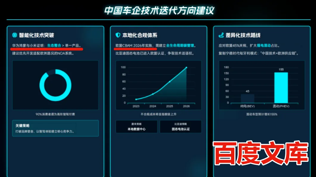 而百度文库生成的页面里,不仅列出了具体的建议,还把关于 「华为鸿蒙生态整合」 和 「欧盟 CBAM 碳关税 2026年实施」 这种极具时效性的细节都抓取出来了。
