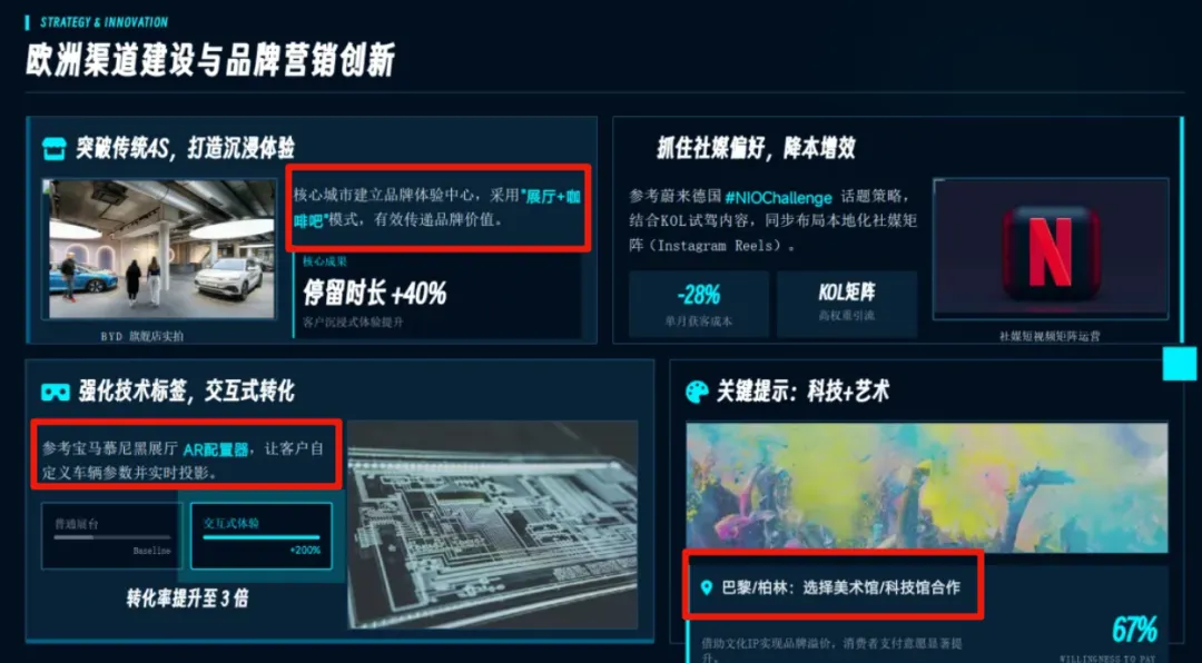 这里表现出了难得的敏锐度,并不是笼统地建议加强营销,而是具体到了要把展厅变成第三空间,用沉浸式的 AR 体验去降低技术理解门槛,甚至点出了要用美术馆联名来提升品牌溢价。