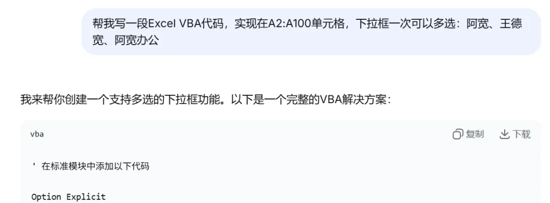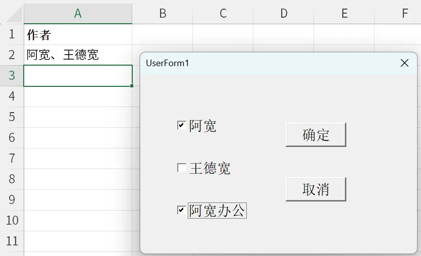 ' 在标准模块中添加以下代码Option Explicit' 声明全局变量Private SelectedItems As CollectionPrivate Const DELIMITER As String = "、"' 初始化选中的项目集合Sub InitializeSelectedItems() Set SelectedItems = New CollectionEnd Sub' 主要的初始化函数(需要在工作簿打开时运行)Sub InitializeMultiSelectDropdown() ' 清除A2:A100单元格的所有验证和值 With Worksheets("Sheet1").Range("A2:A100") .ClearContents .Validation.Delete End With ' 初始化选中的项目集合 InitializeSelectedItems ' 添加数据验证(下拉列表) With Worksheets("Sheet1").Range("A2:A100").Validation .Delete .Add Type:=xlValidateList, AlertStyle:=xlValidAlertStop,_ Operator:=xlBetween, Formula1:="阿宽,王德宽,阿宽办公" .IgnoreBlank = True .InCellDropdown = True .ShowInput = True .ShowError = True End WithEnd Sub' 显示多选窗体 - 这是被工作表事件调用的函数Sub ShowMultiSelectForm(ByVal TargetCell As Range) Dim frm As UserForm1 ' 创建窗体实例 Set frm = New UserForm1 ' 加载已选中的项目 LoadSelectedItems TargetCell.Value ' 在窗体中显示选中的项目 With frm .CheckBox1.Value = IsItemSelected("阿宽") .CheckBox2.Value = IsItemSelected("王德宽") .CheckBox3.Value = IsItemSelected("阿宽办公") .TargetAddress = TargetCell.Address '存储目标单元格地址 .Show End With ' 清理 Unload frm Set frm = NothingEnd Sub' 从单元格值加载已选中的项目到集合Sub LoadSelectedItems(cellValue As String) Dim items() As String Dim i As Integer ' 初始化或清空集合 If SelectedItems Is Nothing Then Set SelectedItems = New Collection Else While SelectedItems.Count > 0 SelectedItems.Remove 1 Wend End If ' 如果单元格有值,则分割并添加到集合 If Len(Trim(cellValue)) > 0 Then items = Split(cellValue, DELIMITER) For i = LBound(items) To UBound(items) If Trim(items(i)) <> "" Then On Error Resume Next SelectedItems.Add Trim(items(i)), Key:=CStr(Trim(items(i))) On Error GoTo 0 End If Next i End IfEnd Sub' 检查项目是否已选中Function IsItemSelected(itemName As String) As Boolean Dim item As Variant If SelectedItems Is Nothing Then Set SelectedItems = New Collection End If On Error GoTo NotSelected ' 尝试通过键访问(更高效) Dim temp As Variant temp = SelectedItems(itemName) IsItemSelected = True Exit FunctionNotSelected: IsItemSelected = FalseEnd Function' 添加选中的项目Sub AddSelectedItem(itemName As String) If SelectedItems Is Nothing Then Set SelectedItems = New Collection End If On Error Resume Next SelectedItems.Add itemName, Key:=itemName On Error GoTo 0End Sub' 移除选中的项目Sub RemoveSelectedItem(itemName As String) Dim i As Integer If SelectedItems Is Nothing Then Exit Sub End If For i = 1 To SelectedItems.Count If SelectedItems(i) = itemName Then SelectedItems.Remove i Exit Sub End If Next iEnd Sub' 获取所有选中项目的字符串Function GetSelectedItemsString() As String Dim result As String Dim item As Variant result = "" If SelectedItems Is Nothing Or SelectedItems.Count = 0 Then GetSelectedItemsString = "" Exit Function End If For Each item In SelectedItems If result = "" Then result = item Else result = result & DELIMITER& item End If Next item GetSelectedItemsString = resultEnd Function