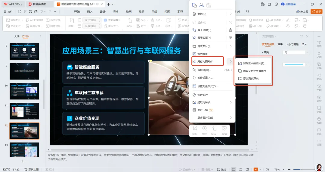 通过WPS导出PPT中单张图片的做法是选中该图片,然后点击鼠标右键,在弹出的菜单中选择“