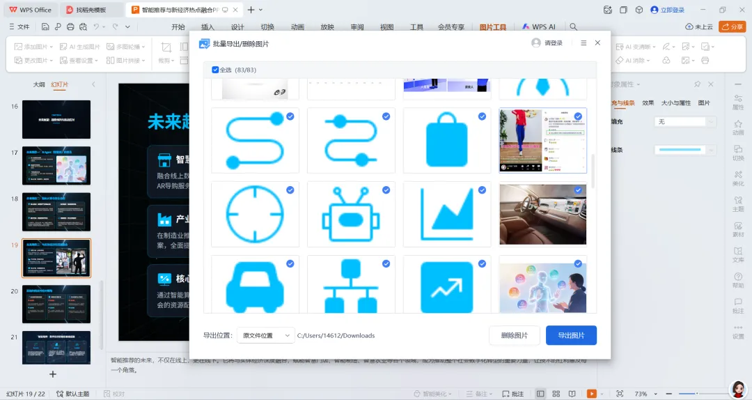 ”。默认是选中了PPT中的所有图片,可以把不需要导出的图片取消选中,也可以删除某些图片再导出。