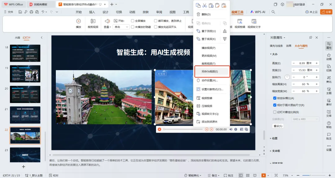 通过WPS导出PPT中单个视频的做法是选中该视频,然后点击鼠标右键,在弹出的菜单中选择“