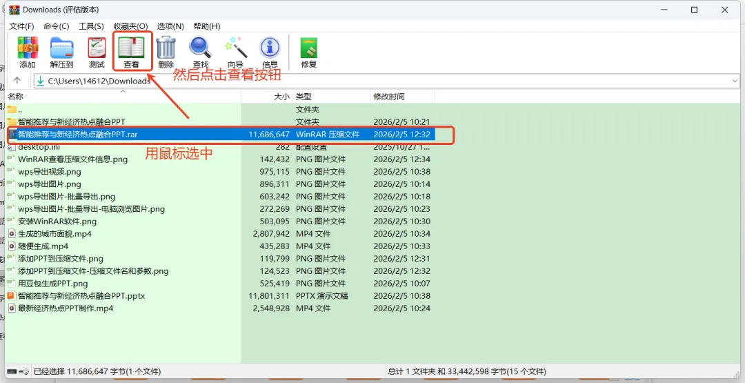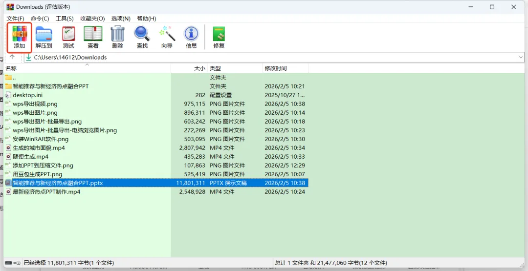 首先用WinRAR压缩工具把你想要导出所有视频和图片的PPT压缩成RAR格式的文件。如下图,打开WinRAR工具,然后选中想要压缩的PPT,接着点击“