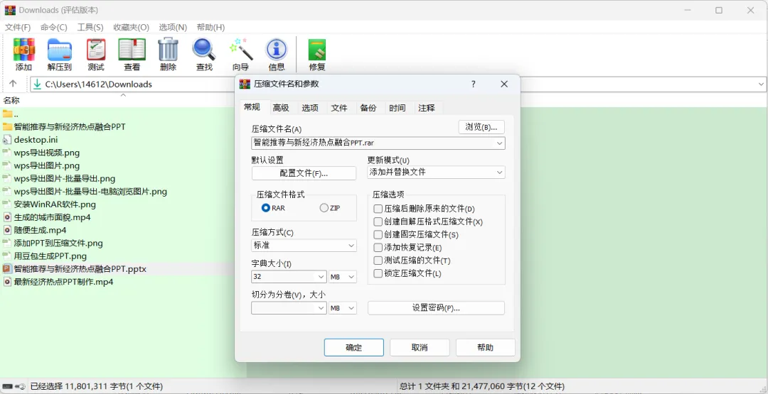 然后配置压缩文件名和参数,记得压缩文件格式一定要选择RAR(也是默认的格式)