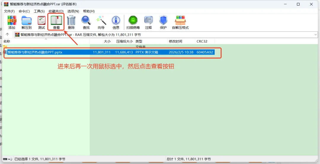 紧接着在WinRAR压缩工具中用鼠标选中上一步得到的压缩文件,然后点击“