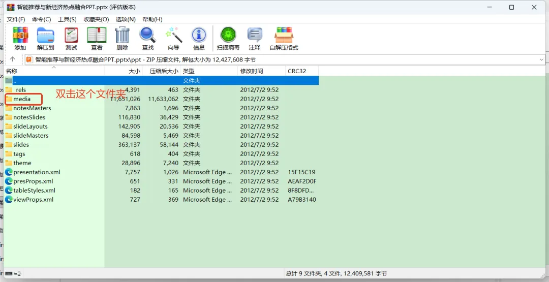 文件夹了,PPT中的所有视频和图片都在这个media目录下了,用鼠标双击media文件夹,如下图: