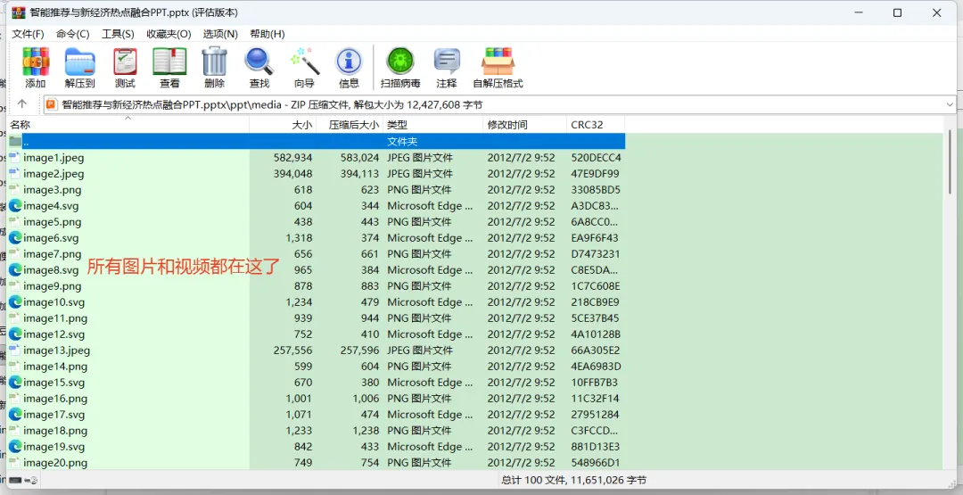 一种是用WPS软件来实现,一种是用压缩工具WinRAR来实现。用WPS软件导出PPT中的视频和图片,估计有不少人知道;但用WinRAR压缩工具来实现一次性导出PPT中的所有图片和视频,这条妙计就很少有人知道了。