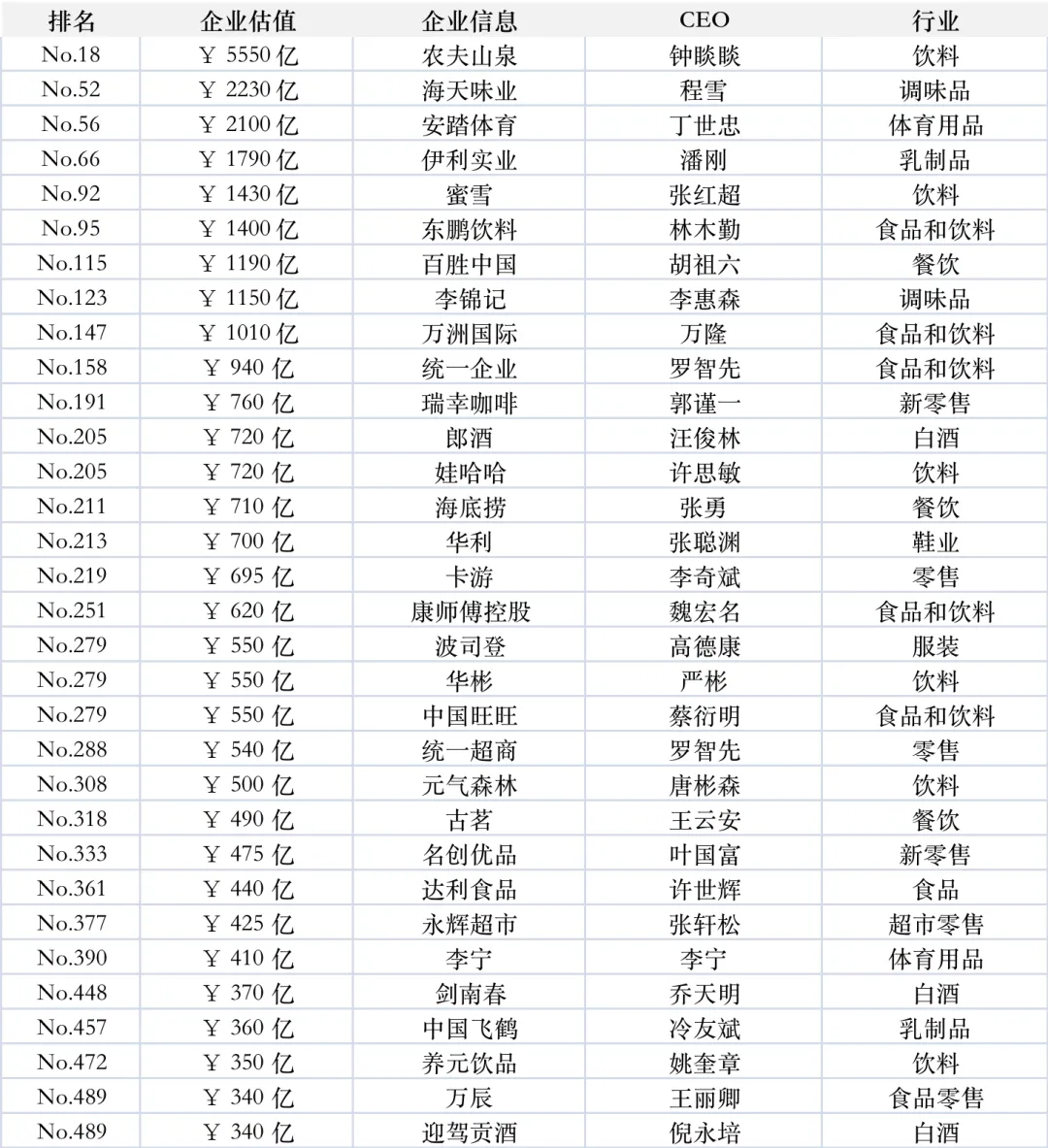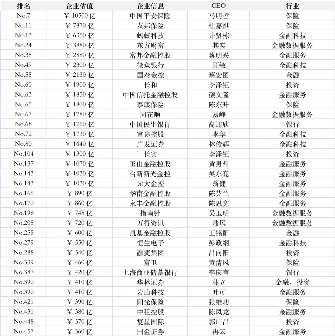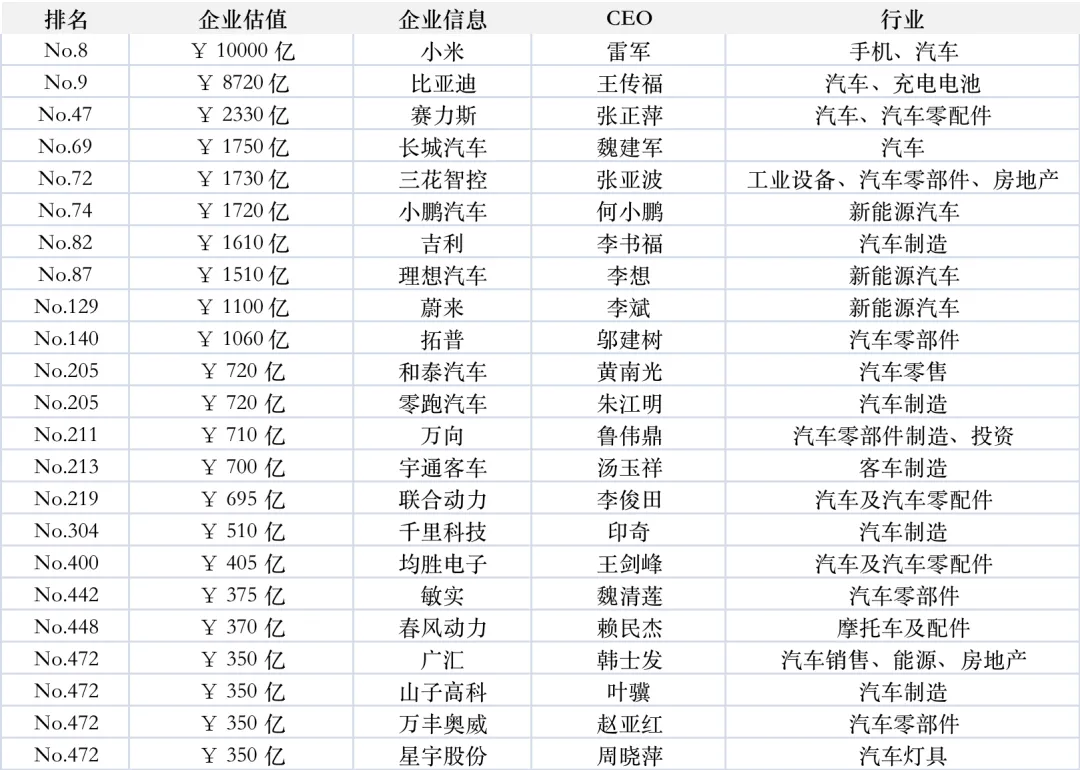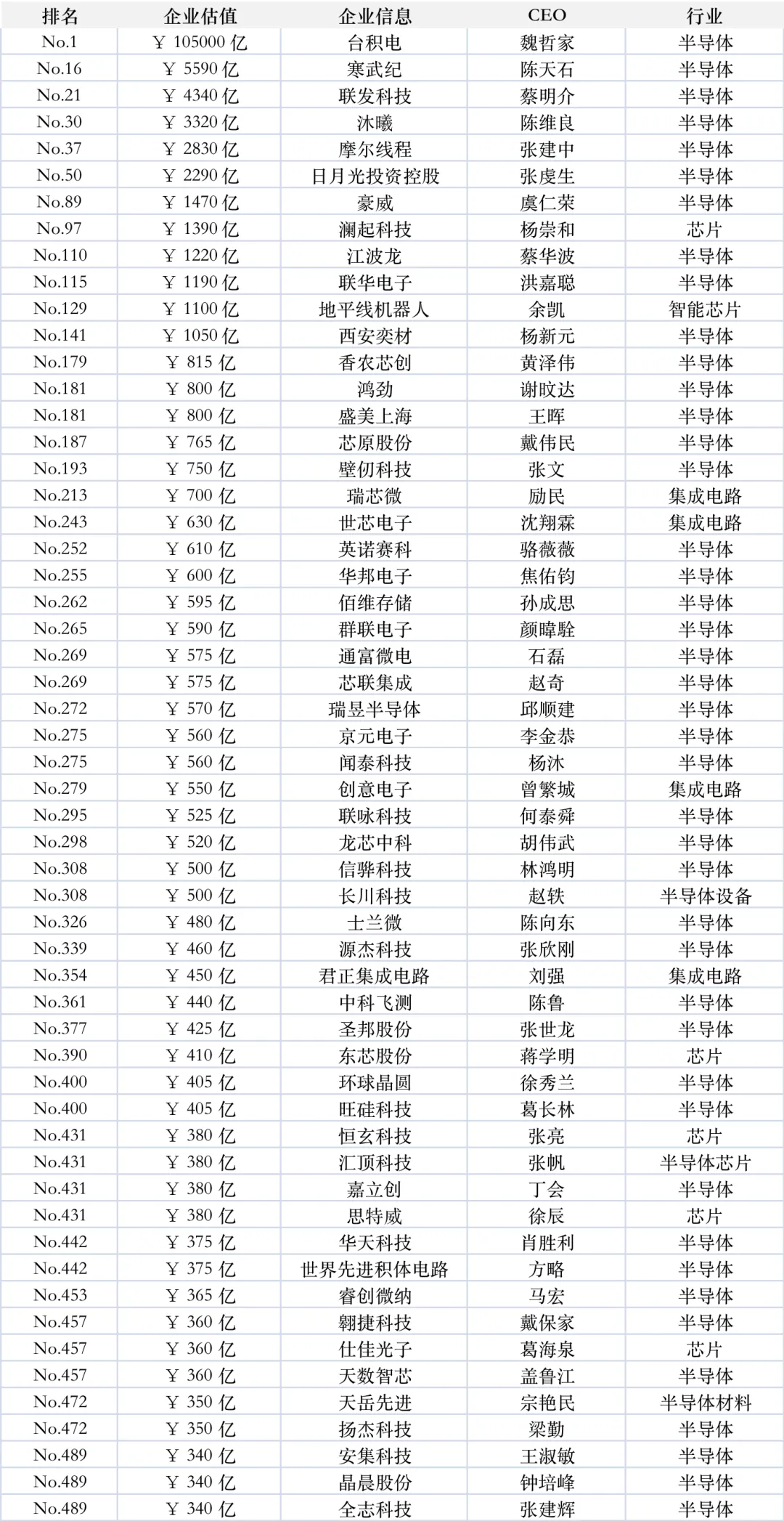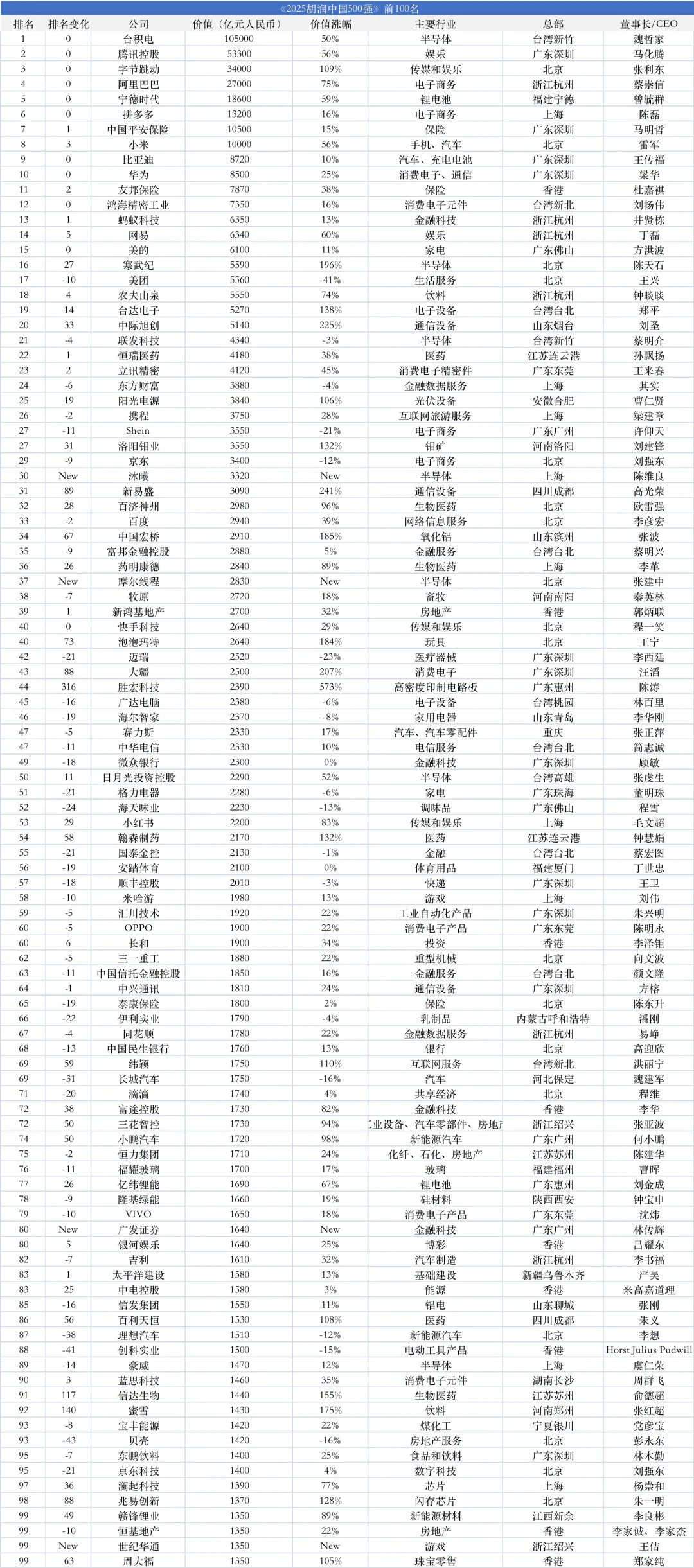 来源:胡润研究院2月5日发布的《2025胡润中国500强》前100名中,总部所在地分布:广东22家(其中深圳11家)、北京18家、台湾11家、上海9家、香港9家、浙江8家(其中杭州6家)、江苏4家、山东4家。行业分布:半导体7家、汽车行业7家、金融科技4家、电子商务4家、生物医药3家、保险3家、传媒娱乐3家、通信设备3家。前100名中,价值涨幅最高的4家分别是胜宏科技573%、新易盛241%、中际旭创225%、大疆207%;价值降幅最高的4家分别是美团-41%、迈瑞-23%、Shein-21%、长城汽车-16%、贝壳-16%。2025中国500强前100名:包括台积电、腾讯、字节跳动、阿里巴巴、宁德时代、拼多多、平安保险、小米、比亚迪、华为、友邦保险、鸿海精密、蚂蚁科技、网易、美的、寒武纪、美团、农夫山泉、台达电子、中际旭创、携程、京东、百度、大疆、格力电器、小红书、米哈游、汇川技术、隆基绿能、蓝思科技、兆易创新、周大福等。