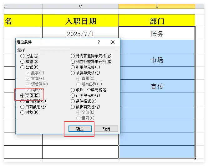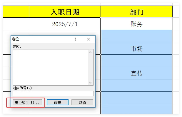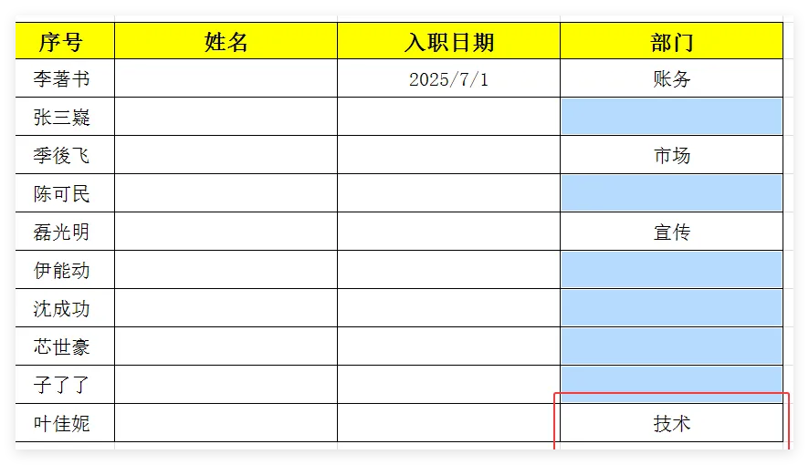 当然我们也可能用Ctrl+G,定位空值来选择剩下的属于“技术部”的单元格