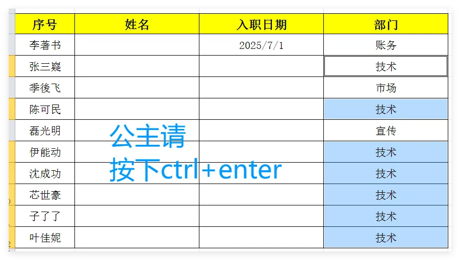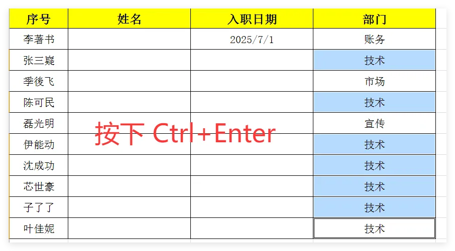2.输入内容(如“技术部”),按下 Ctrl+Enter ,所有选中单元格会同时填入该内容。