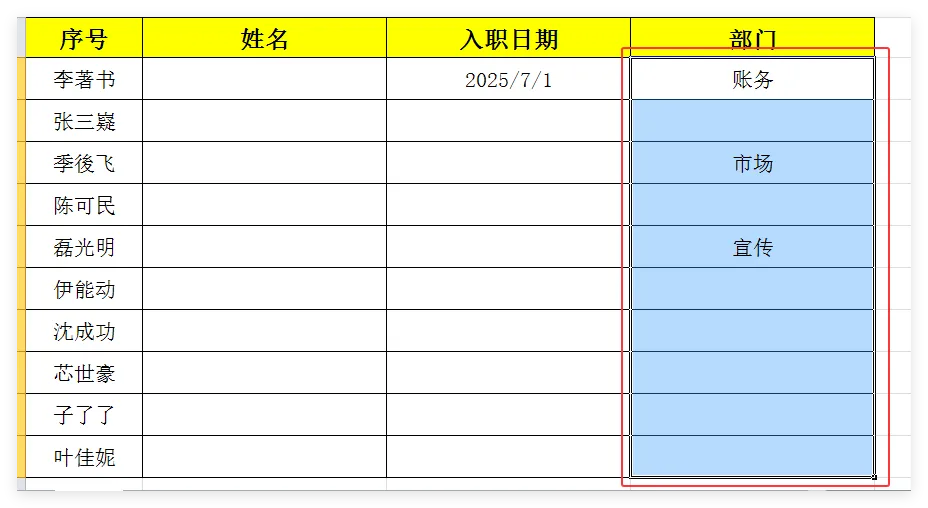 3.市场部列:如果要复制固定值(如C列“市场部”):输入第一个单元格后,直接拖动填充柄,所有单元格会复制该值。