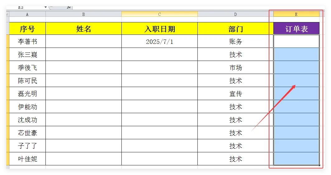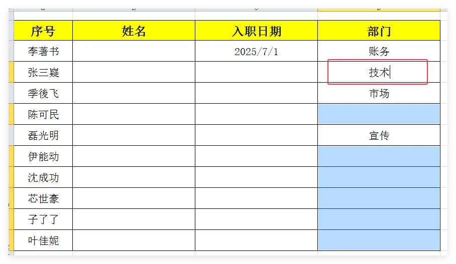 实例:在“员工信息表”中,需要给多行同一部门(如“技术部”)的记录统一录入部门名称。