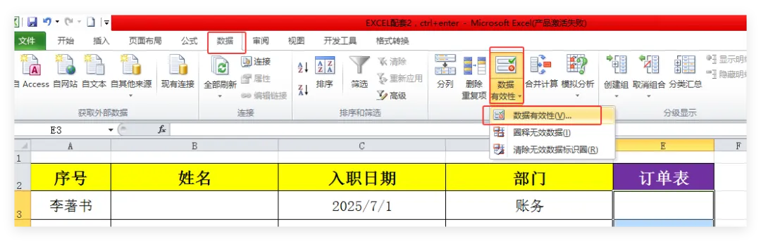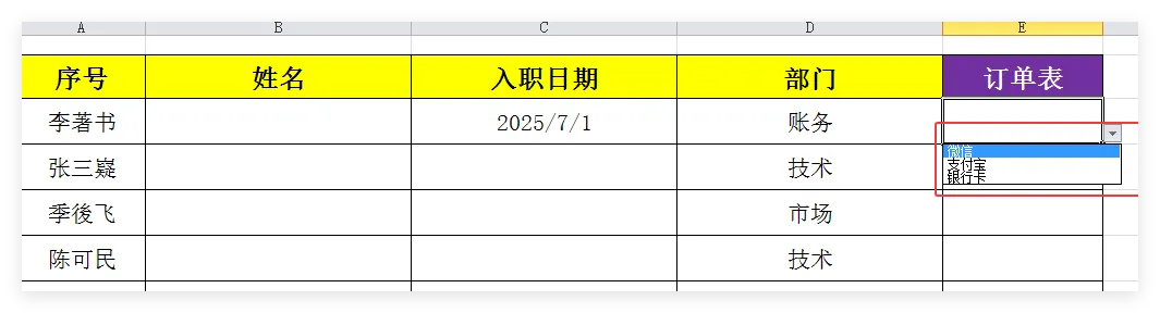 实例:在“订单表”的“支付方式”列(只能是“微信”“支付宝”“银行卡”),需快速选择录入。