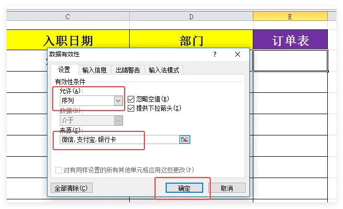 3.在“来源”中输入选项(用英文逗号分隔:微信,支付宝,银行卡),点击确定;