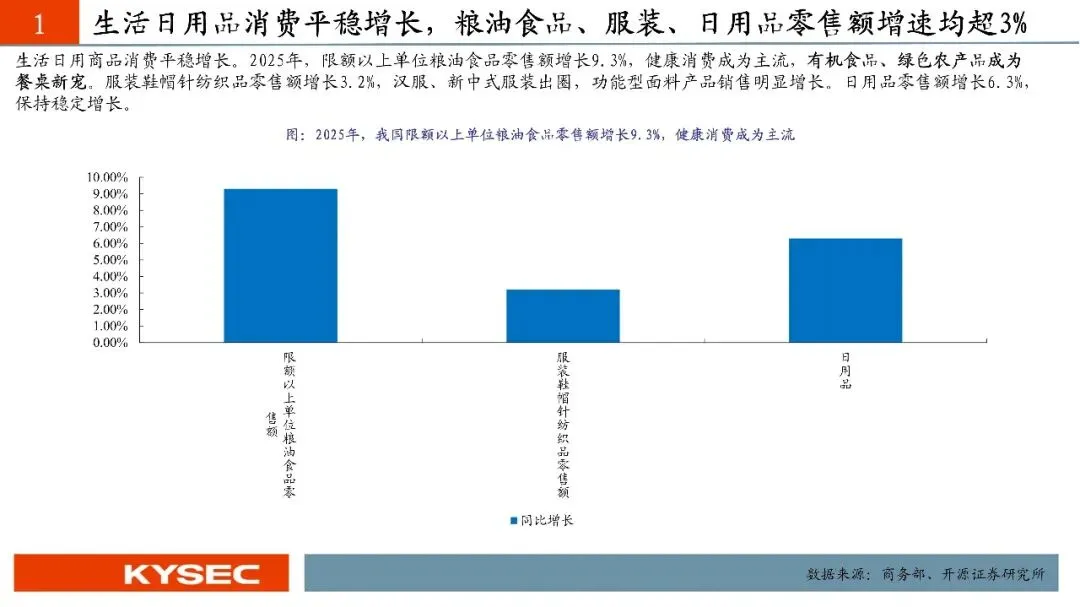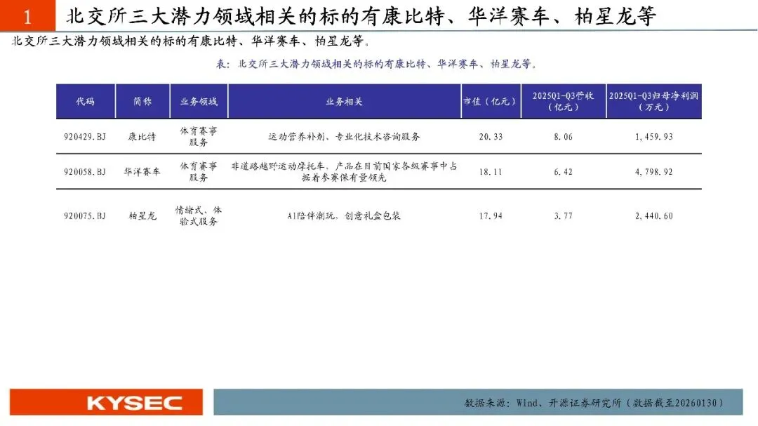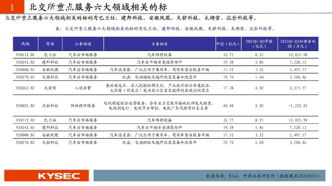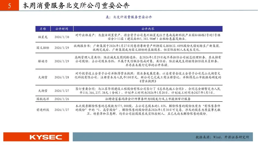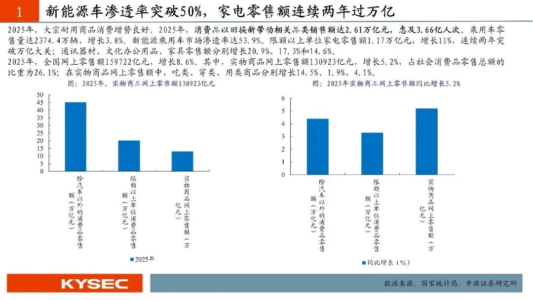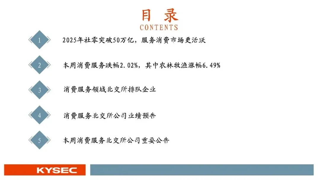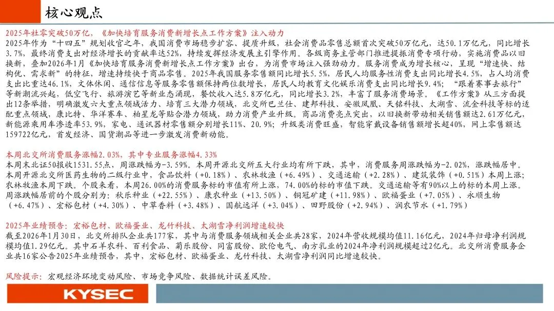 2025年作为“十四五”规划收官之年,我国消费市场稳步扩容、提质升级,社会消费品零售总额首次突破50万亿元,达50.1万亿元,同比增长3.7%,最终消费支出对经济增长的贡献率达52%,持续发挥经济发展主引擎作用。各级商务主管部门推进提振消费专项行动,实施消费品以旧换新,叠加2026年1月《加快培育服务消费新增长点工作方案》出台,为消费市场注入强劲动力。服务消费成为增长核心,呈现“增速快、结构优、需求新”的特征,增速持续快于商品零售。2025年我国服务零售额同比增长5.5%,居民人均服务性消费支出同比增长4.5%,占人均消费支出比重达46.1%,文体休闲、通信信息等服务零售额保持两位数增长,居民人均教育文化娱乐消费支出同比增长9.4%;“跟着赛事去旅行”等新潮流兴起,低空飞行、旅游演艺等新业态涌现,餐饮收入达5.8万亿元,同比增长3.2%,丰富了服务消费场景。《工作方案》从三方面提出12条举措,明确激发六大重点领域活力、培育三大潜力领域,北交所巴兰仕、建邦科技、安徽凤凰、天铭科技、太湖雪、流金科技等标的适配重点领域,康比特、华洋赛车、柏星龙等贴合潜力领域,助力消费产业升级。商品消费亮点突出,以旧换新带动相关销售额达2.61万亿元,新能源乘用车渗透率53.9%,家电、通讯器材零售额分别增长11%、20.9%;升级类消费旺盛,智能穿戴设备销售额增长超40%,网上零售额达159722亿元,首发经济、国货潮品等进一步激发消费新动能。