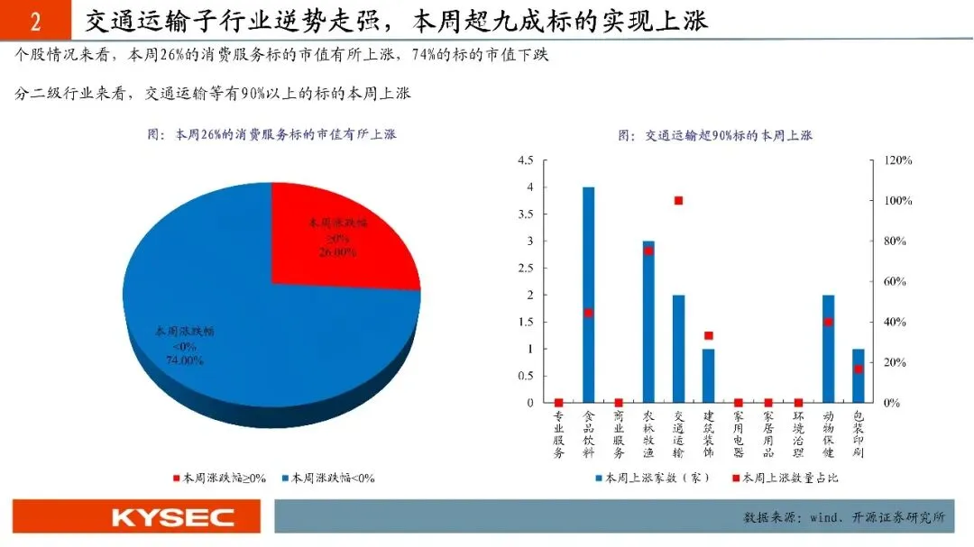 本周末北证50报收1531.55点,周涨跌幅为-3.59%。本周开源北交所五大行业均有所下跌,其中,消费服务周涨跌幅为-2.02%,涨跌幅居中。本周开源北交所医药生物的二级行业中,食品饮料(+0.18%)、农林牧渔(+6.49%)、交通运输(+2.28%)、建筑装饰(+0.51%)本周上涨;农林牧渔本周下跌。个股来看,本周26.00%的消费服务标的市值有所上涨,74.00%的标的市值下跌。交通运输等有90%以上的标的本周上涨。周涨跌幅居前的个股分别为:秋乐种业(+22.55%)、康农种业(+13.50%)、铜冠矿建(+11.98%)、欧福蛋业(+7.05%)、永顺生物(+6.47%)、宏裕包材(+4.30%)、中草香料(+3.48%)、国航远洋(+3.04%)、田野股份(+2.94%)、润农节水(+1.79%)