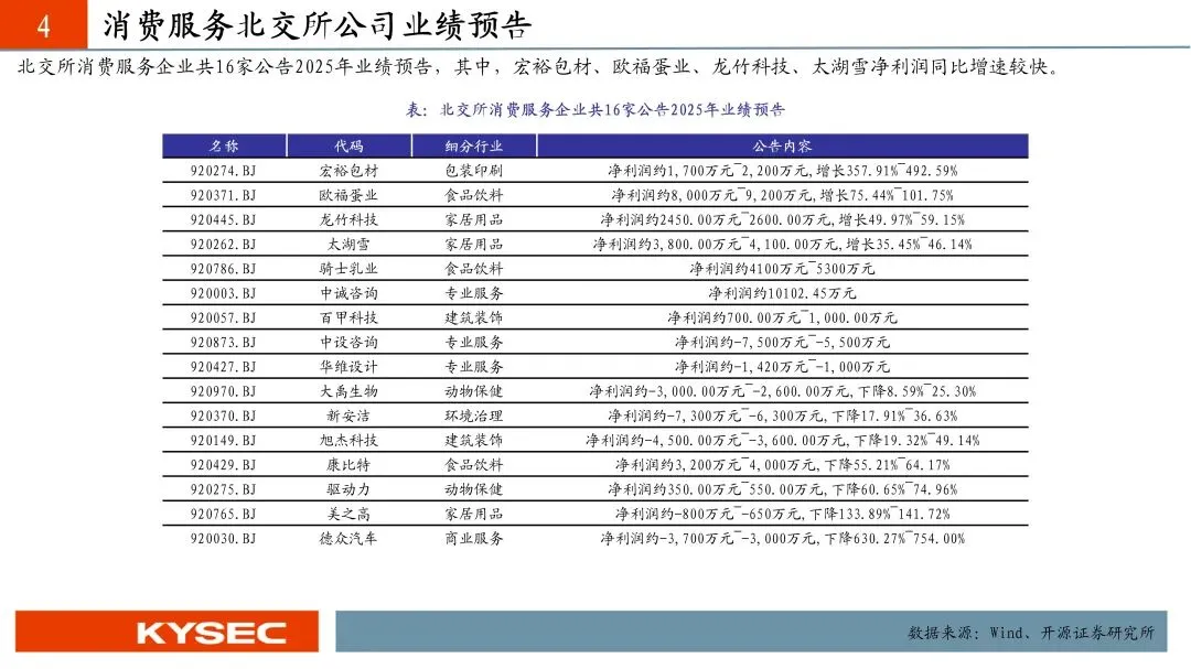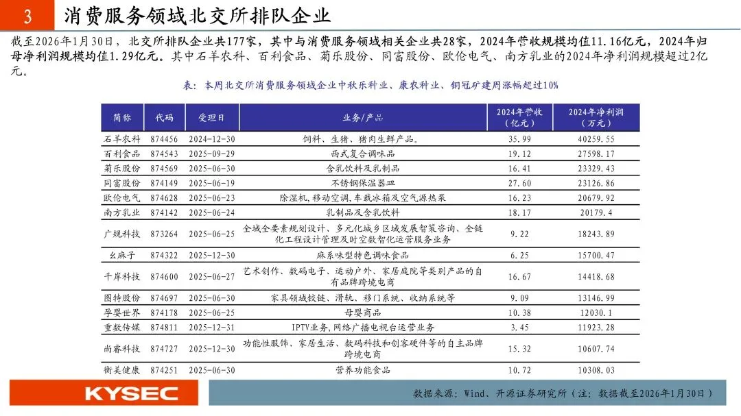 截至2026年1月30日,北交所排队企业共177家,其中与消费服务领域相关企业共28家,2024年营收规模均值11.16亿元,2024年归母净利润规模均值1.29亿元。其中石羊农科、百利食品、菊乐股份、同富股份、欧伦电气、南方乳业的2024年净利润规模超过2亿元。北交所消费服务企业共16家公告2025年业绩预告,其中,宏裕包材、欧福蛋业、龙竹科技、太湖雪净利润同比增速较快。