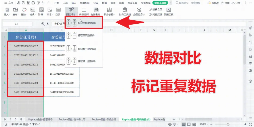 首先,选中包含数据的A列单元格区域,然后在工具栏中找到“数据对比”选项,点击后选择“标记重复数据”。