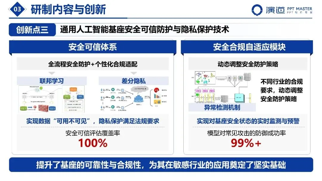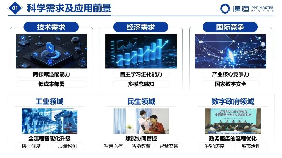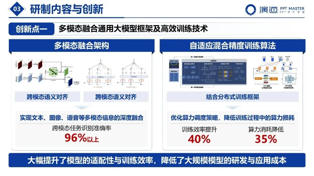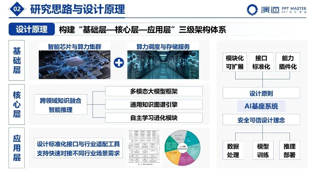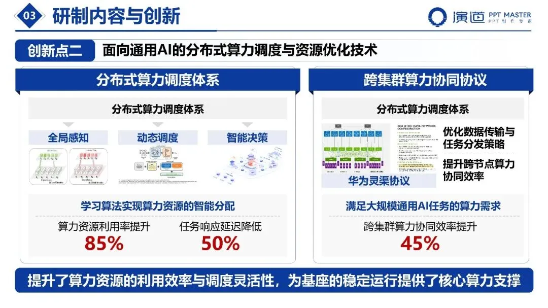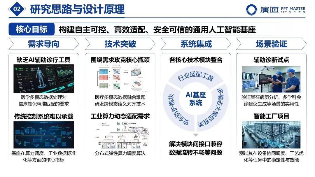 PPT 以 “研究思路 — 设计原理 — 创新突破” 为主线,先明确 “需求导向 — 技术突破 — 系统集成 — 场景验证” 的研发路径,再解析三级架构的设计逻辑,最后从多模态融合大模型与分布式算力调度两大维度呈现核心创新,逻辑闭环、层次清晰,凸显项目的系统性与前瞻性。