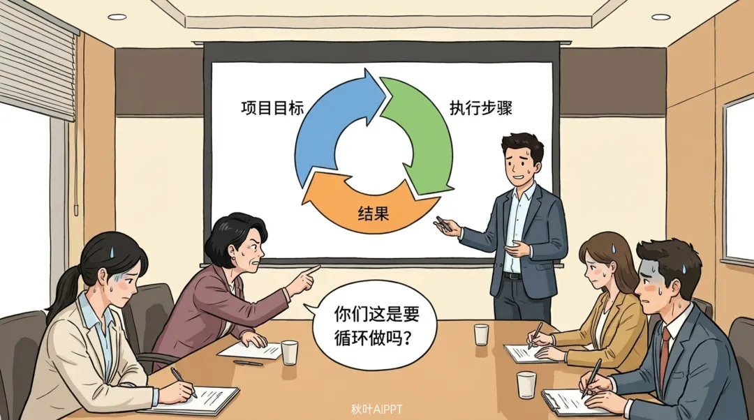 前几天帮一个学员改汇报 PPT,他把“项目目标→执行步骤→成果”三个递进关系的内容,用了个循环图,结果领导问:“你们这是要循环做吗?”
